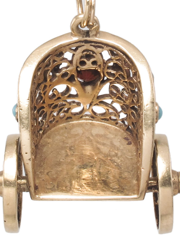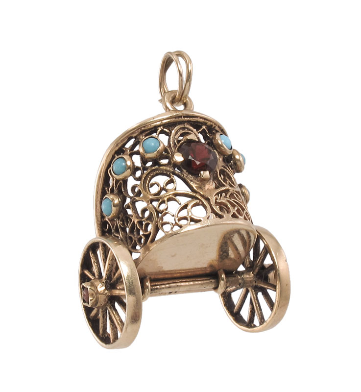 14K GOLD CHARIOT FIGURAL CHARM: 14K mechanical chariot charm contains one round faceted garnet and 6 round cabochon turquoise. Weight: 6.8 grams.