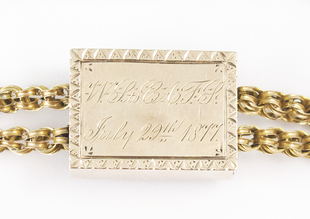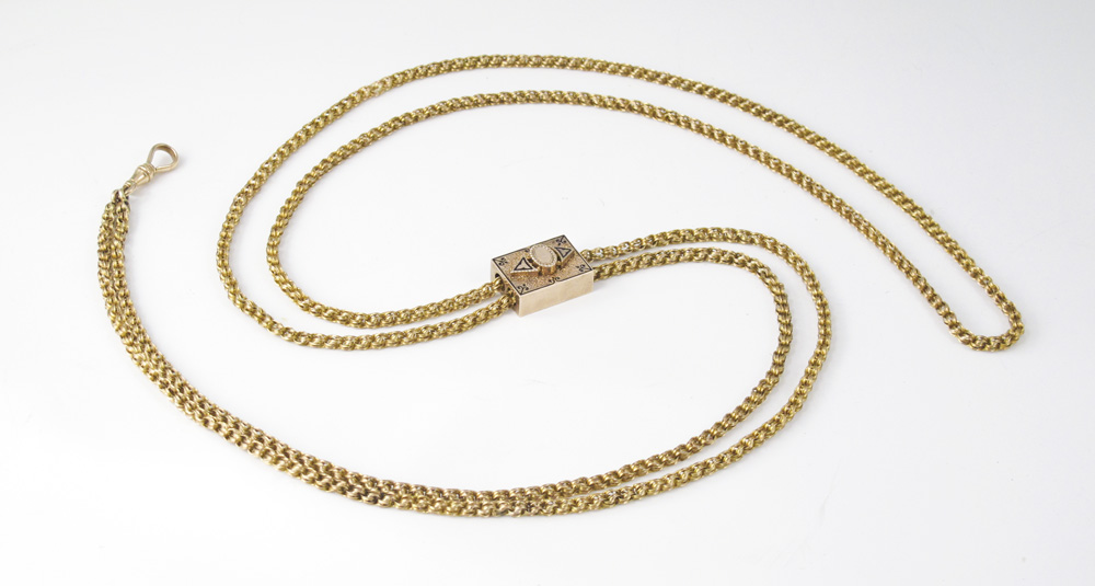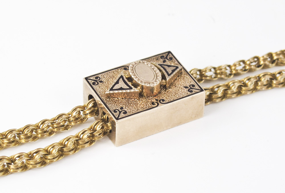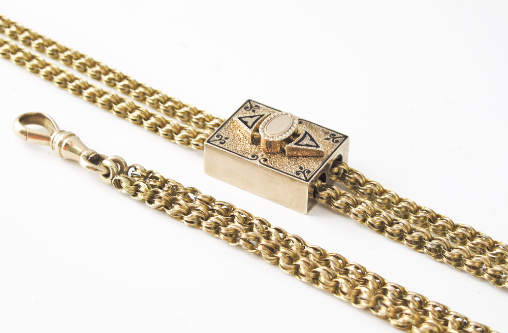 14K VICTORIAN WATCH CHAIN AND SLIDE: 14K yellow gold watch chain with large rectangular slide. Black enamel decoration and inscription and date 1877 on reverse. Cork is intact inside of slide. Swivel hook. Weight: 41.0 grams. Length: 62''