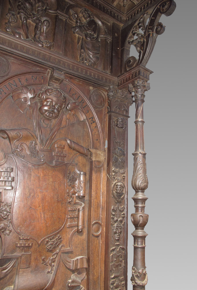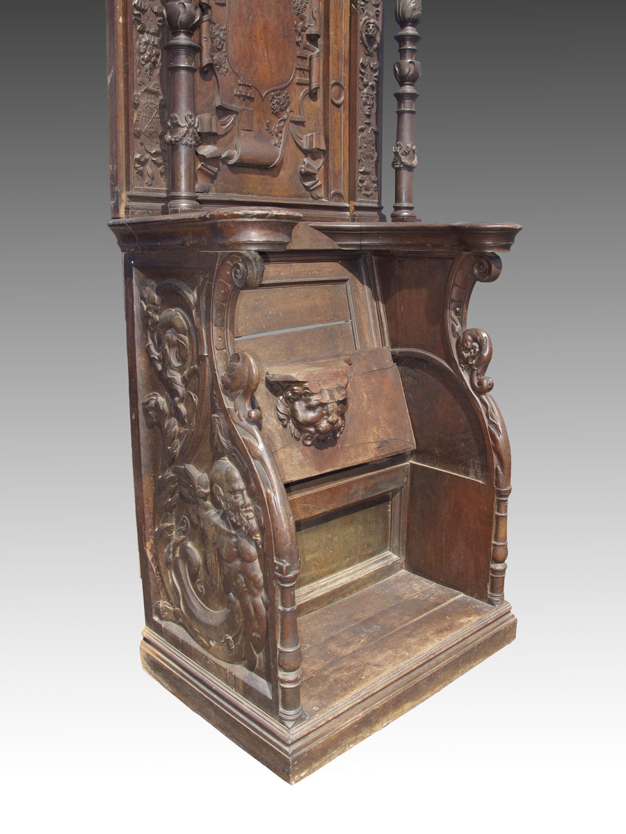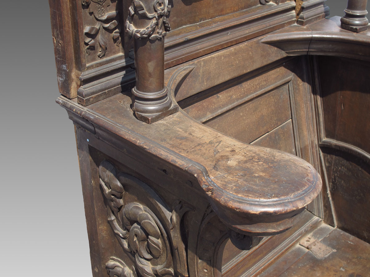 10 FT TALL 17TH CENTURY ITALIAN BISHOP'S CHAIR: Circa mid 17th century, heavily carved with masquerons, putti, religious symbols. Top crest with figures and carved relief bust of King David. Carved full column supports for top section, hinged seat. Motto ''Domine Miserere Mei'' translated as ''Lord, Have Mercy on Me'' inscribed on back panel. Approx. 10'2'' h. x 36'' x 23 1/2''.