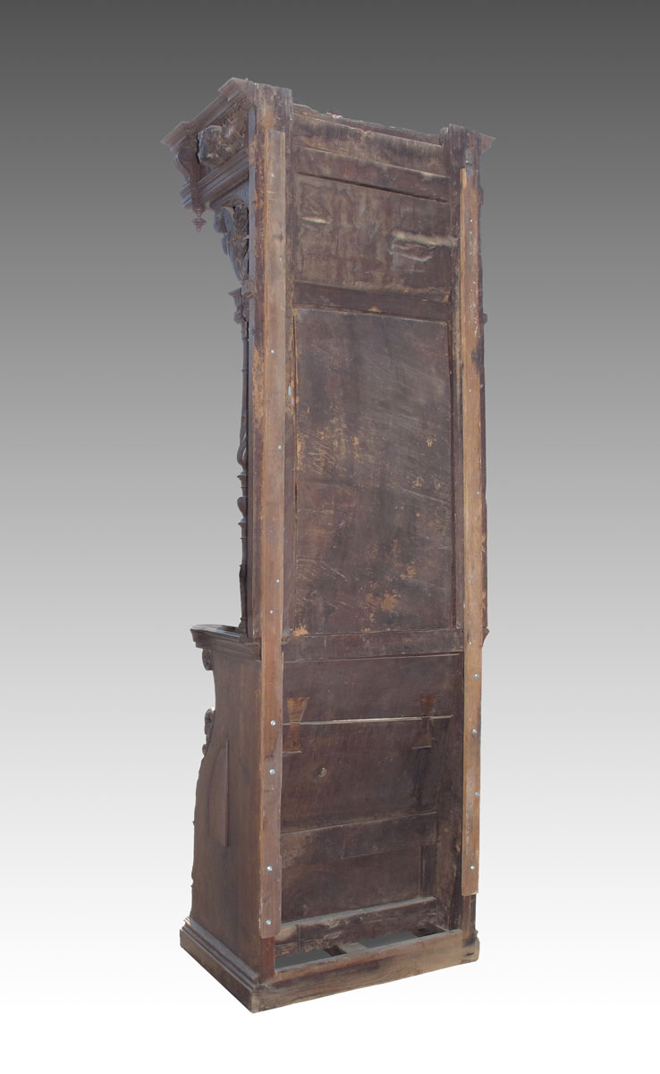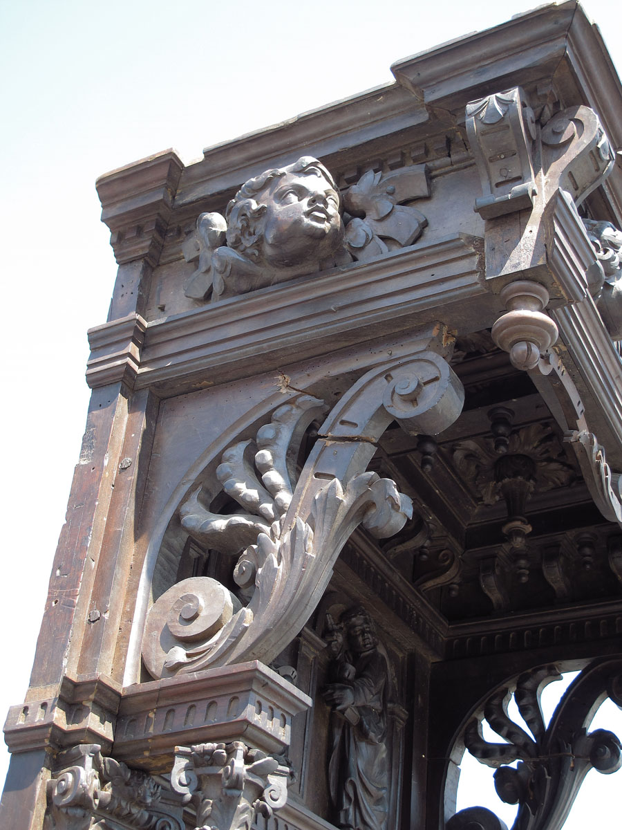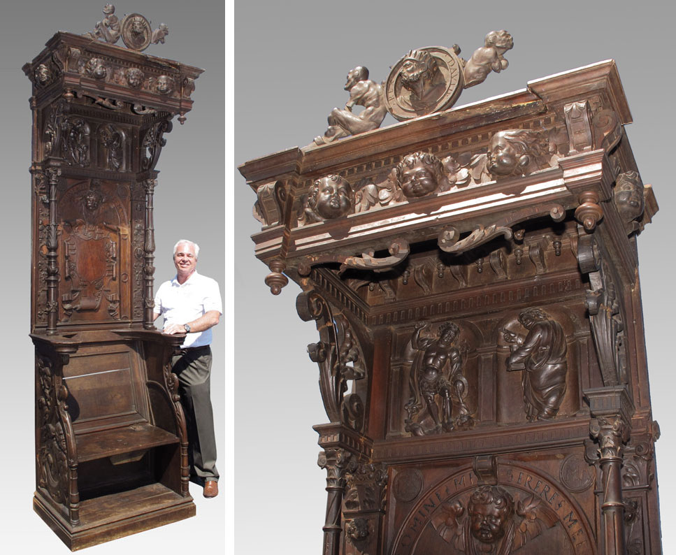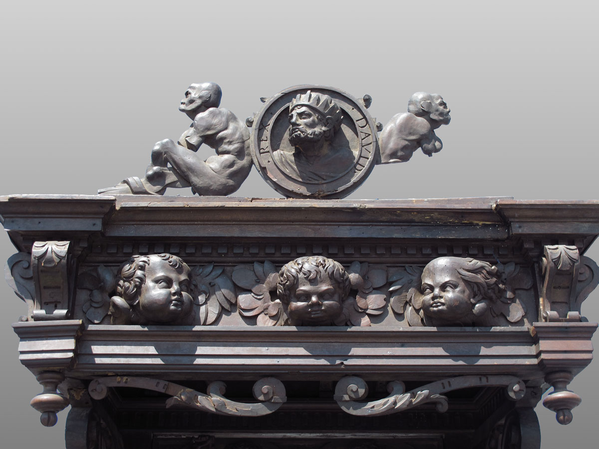 10 FT TALL 17TH CENTURY ITALIAN BISHOP'S CHAIR: Circa mid 17th century, heavily carved with masquerons, putti, religious symbols. Top crest with figures and carved relief bust of King David. Carved full column supports for top section, hinged seat. Motto ''Domine Miserere Mei'' translated as ''Lord, Have Mercy on Me'' inscribed on back panel. Approx. 10'2'' h. x 36'' x 23 1/2''.