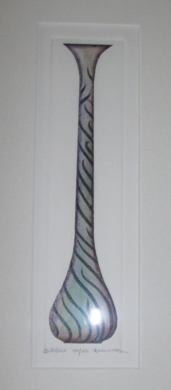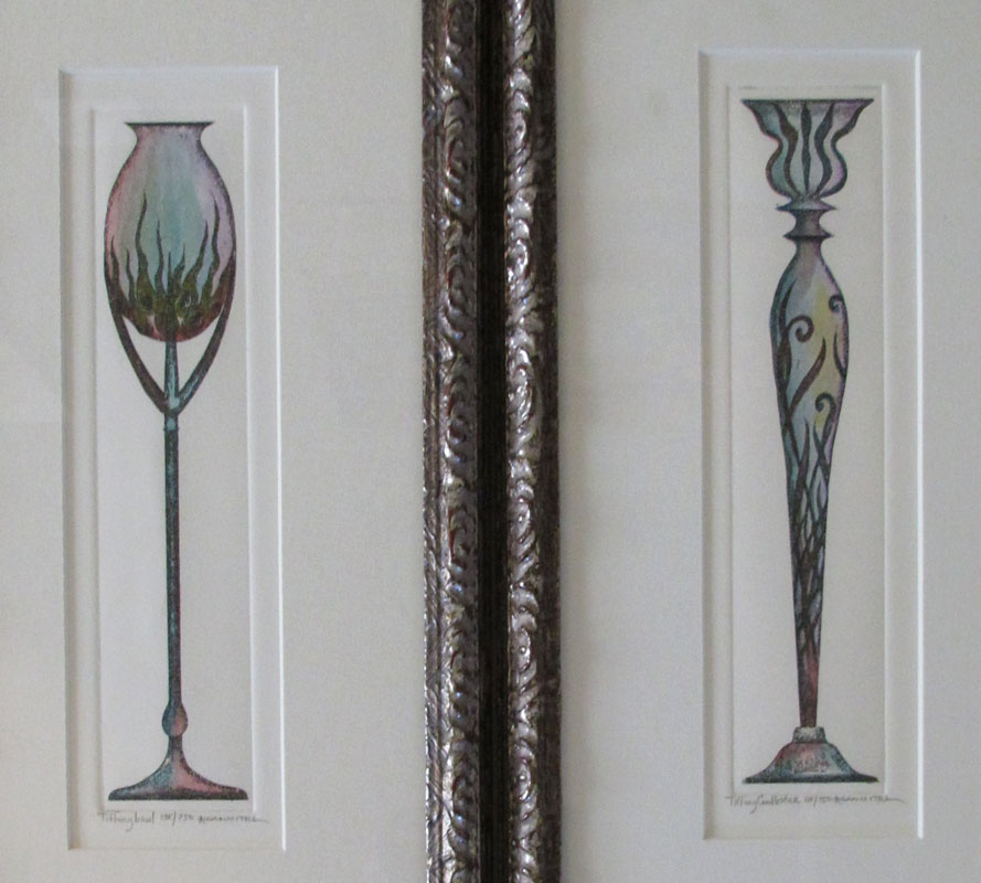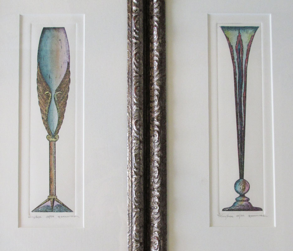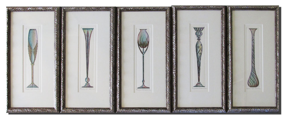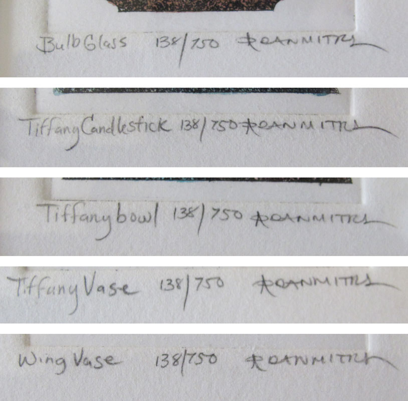 MITRA, Dan, (American, ): 5 vase, ''Bulb Glass'', ''Wing Vase'', ''Tiffany Candlestick'', ''Tiffany Bowl'', ''Tiffany Vase'', Etchings, signed, titled, numbered 138/750, matching frames, sight size 11 1/2'' x 3 1/2'', framed 16 3/4'' x 10 1/4''.