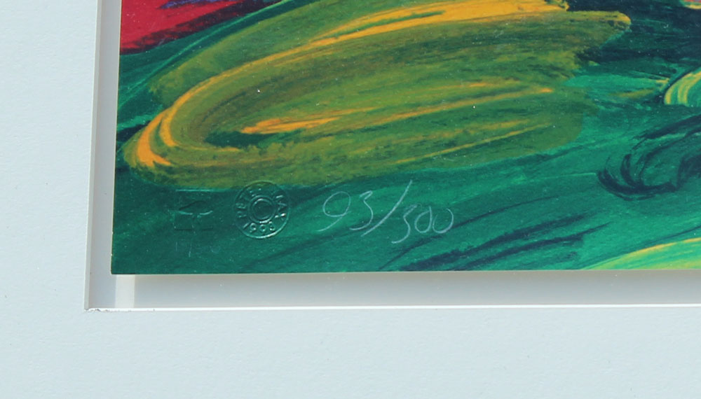 PETER MAX ''FLOWER BLOSSOM LADY'' SERIGRAPH: 30'' x 40'', signed lower right, numbered lower left 93/300, blindstamp with date 1993, framed with wear, 43'' x 50 1/2''.