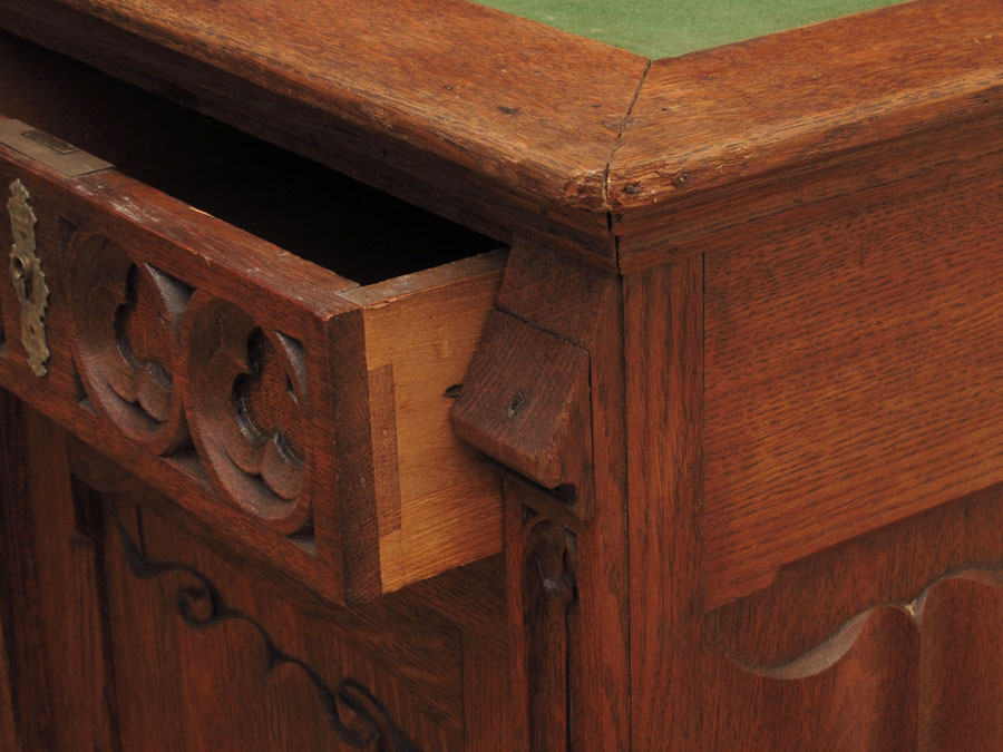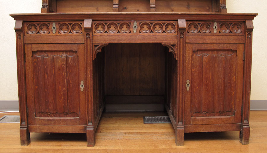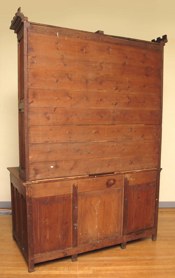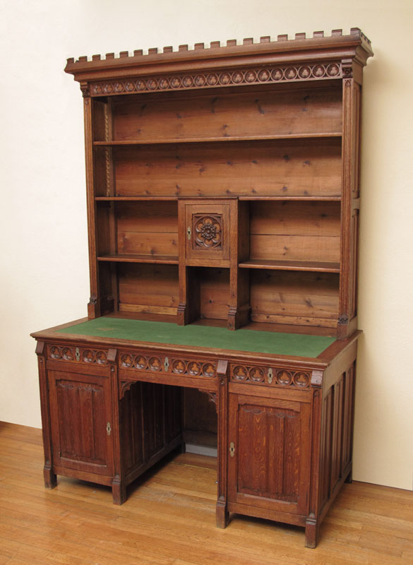 BELGIAN GOTHIC CARVED OAK BOOKCASE DESK: Architectural 2 part bookcase on desk salvaged and personally carried out of a Belgian church by the consignor. Linen fold carving to the sides, exaggerated dentil molding at the crest, trefoil carved frieze across the fronts. Kneehole desk with center drawer, 2 side doors and felt writing surface. The upper section with adjustable upper two shelves. Measures approx. 7.5 ft tall x 5'1'' wide x 30'' deep.