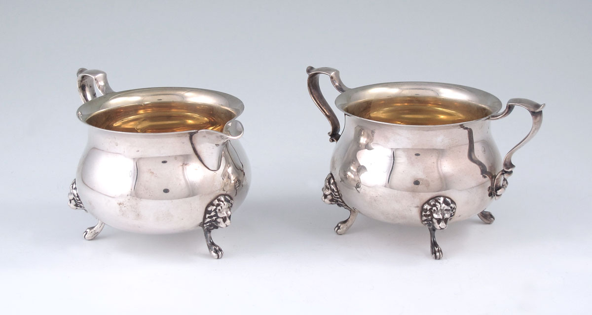 POOLE GEORGIAN STERLING CREAMER AND SUGAR: 2 piece creamer and sugar in the Georgian pattern with vermeil interior and paw feet to include 1) Open creamer, 3'' h. x 4 5/8''. 2) Open sugar 3'' h. x 5 1/8''. Approx. 9.9 troy oz.