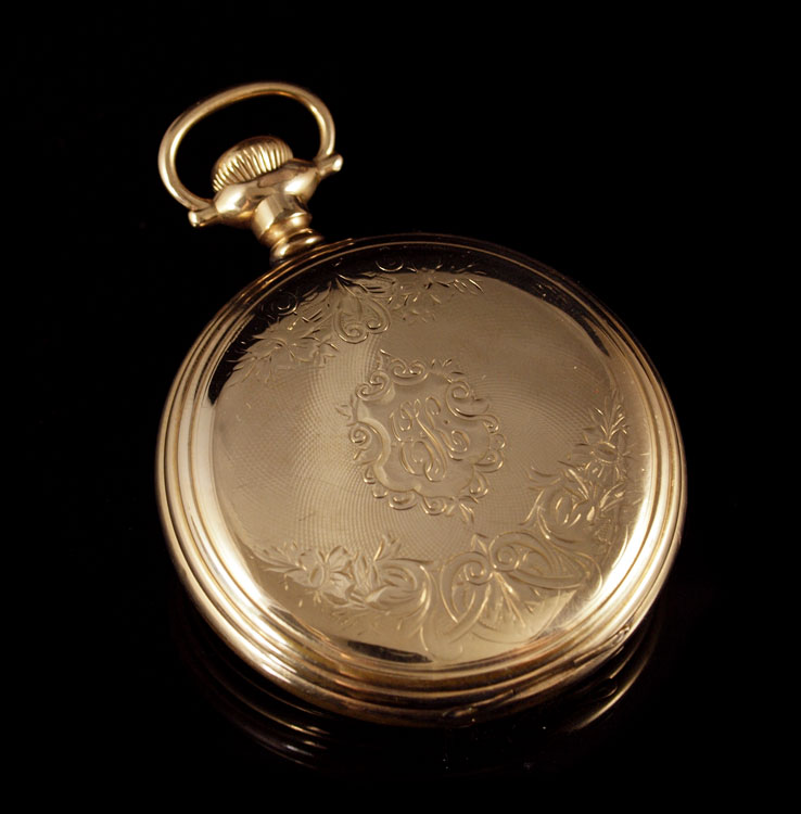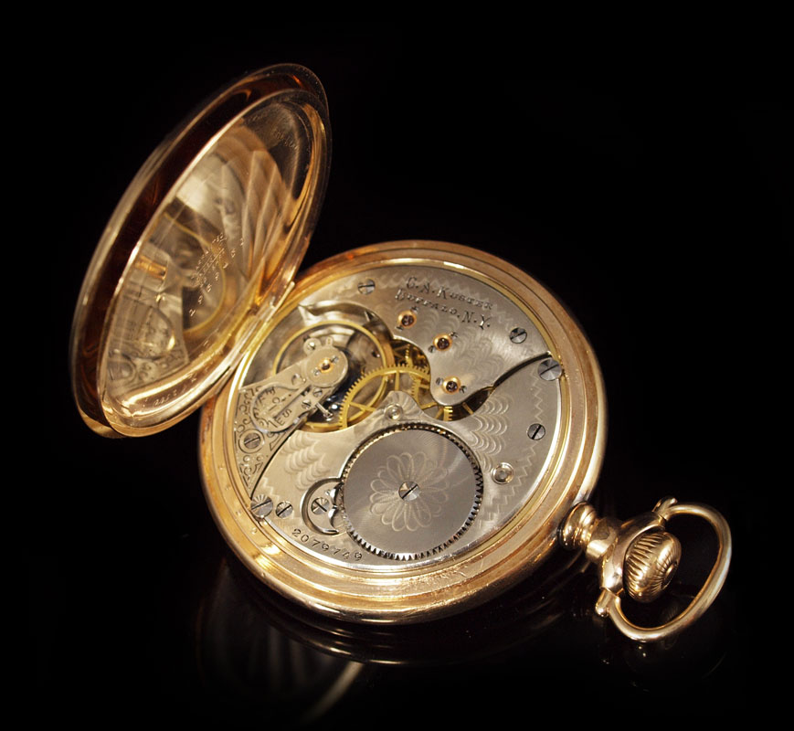 KUSTER HUNTERS CASE GOLD FILLED POCKET WATCH: Kuster size 16 gold filled hunters case pocket watch, movement made by Waltham. 15 jewel movement, movement serial number 2079749, case number 1959450. Plastic crystal. 2'' dia.