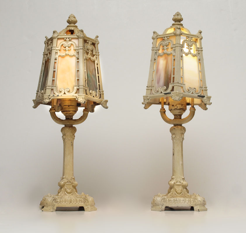 PAIR OF VINTAGE SLAG GLASS BOUDOIR LAMPS: 6 panel blue and caramel slag glass shades. Original painted finish 15 1/2'' tall.