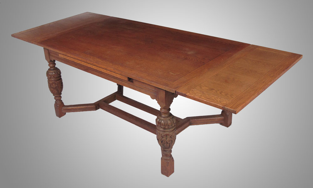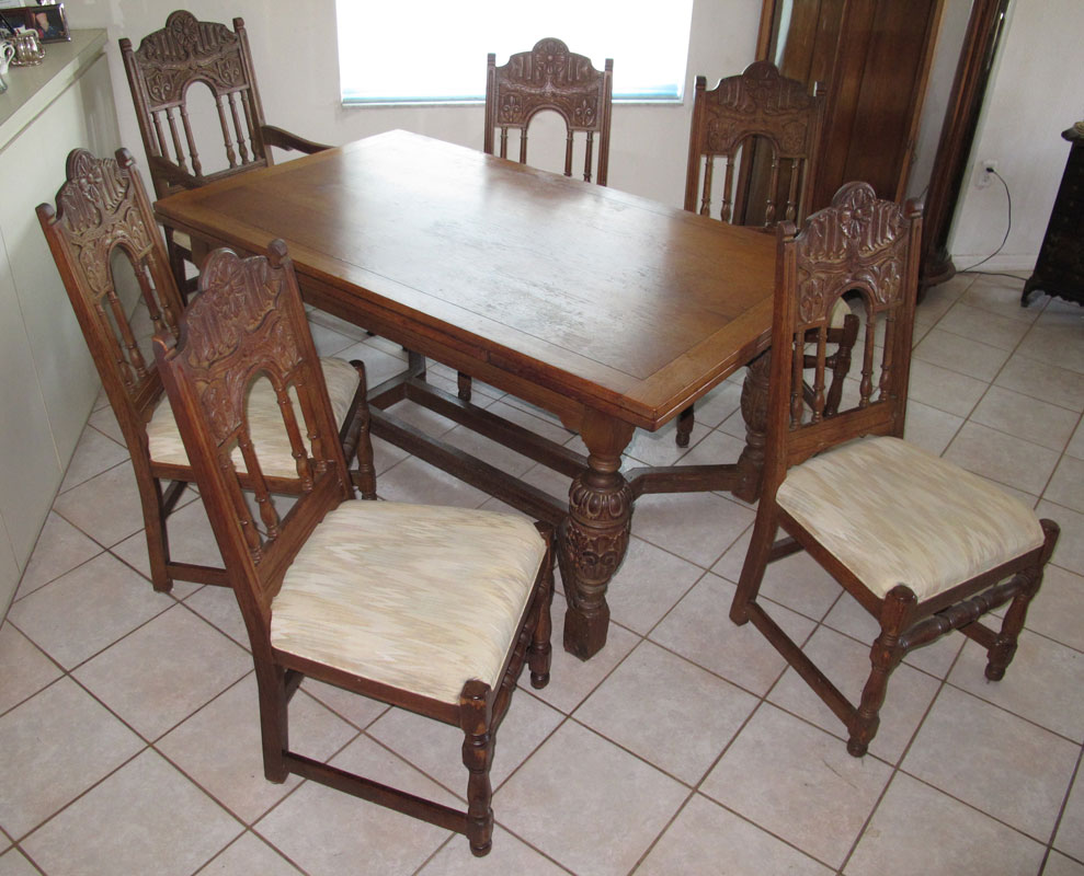 DRAW LEAF CARVED OAK DINING TABLE AND 6 CHAIRS: Oak top table with carved legs and shaped stretchers. 30 1/8'' h. x 56'' x 38'', 2 draw leaves measures 16 1/2''. Sold with 1 arm and 5 side chairs, arm chair 44 1/2'' h. x 23 1/4'' x 26''.