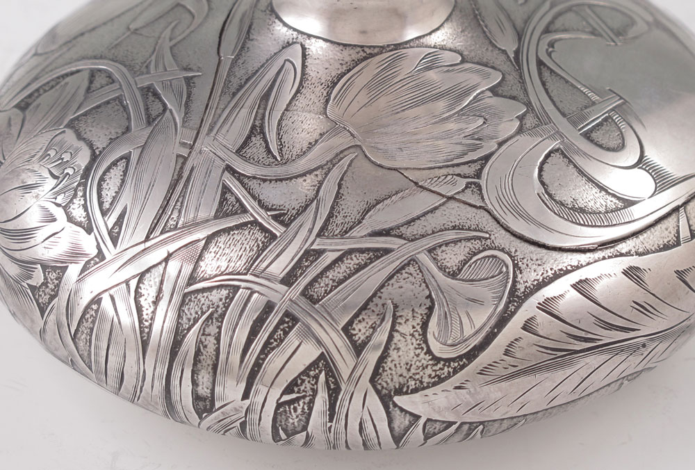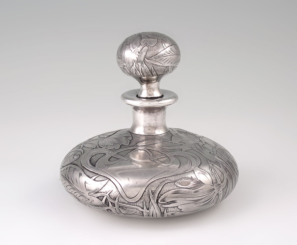 ART NOUVEAU STERLING OVER GLASS PERFUME BOTTLE: Art Nouveau lotus flower and cattails motif with matching stopper. Marked Sterling 356 on base. Measures 4 1/2'' h. x 5'' dia.