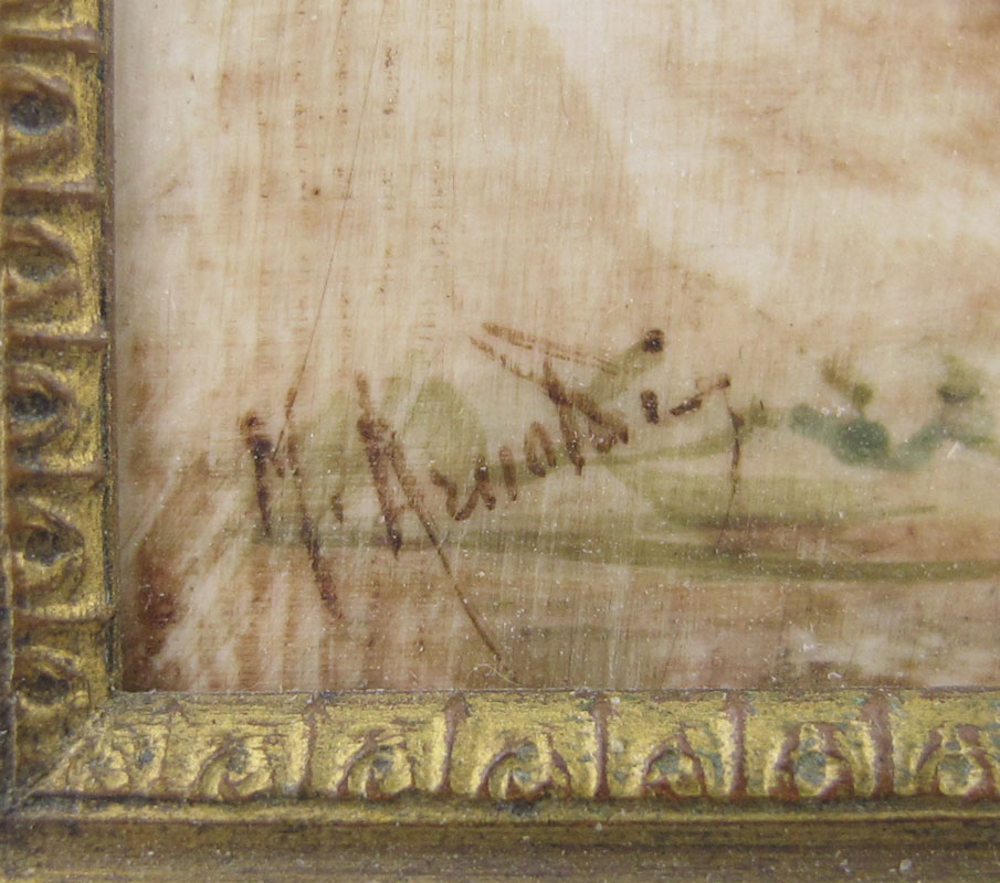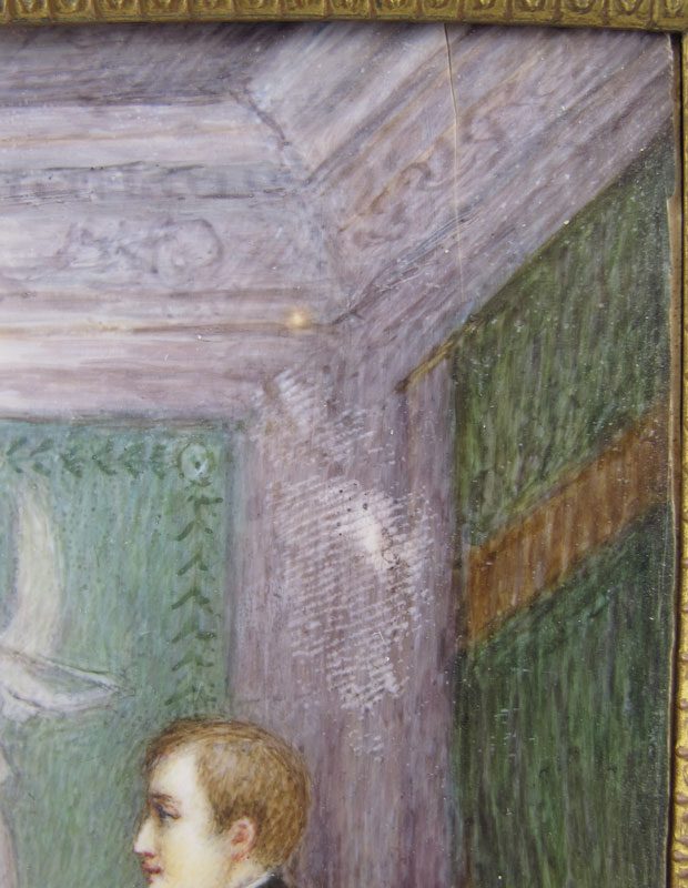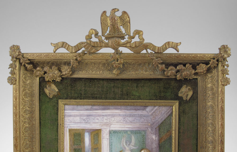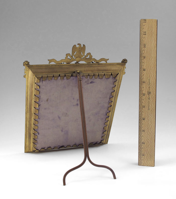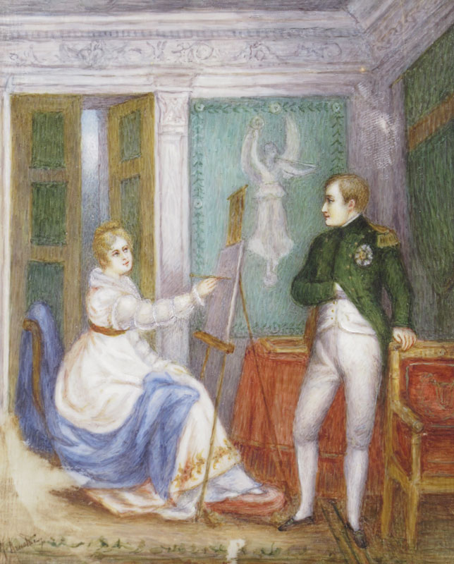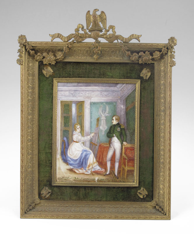 JOSEPHINE PAINTING NAPOLEON MINIATURE PAINTING ON IVORY: Sight size 5 1/2'' x 4 1/2'', illegibly signed lower left, gilded metal frame with eagle cartouche, 11'' x 8 3/8''.