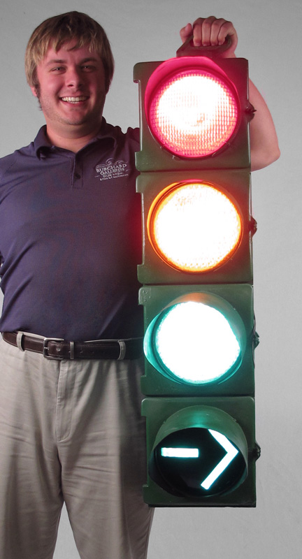 GREEN PAINTED 4 LIGHT TRAFFIC SIGNAL LIGHT: Standard 3 lights with addition right turn signal. 42 1/2'' h. x 11'' x 13 1/2''.