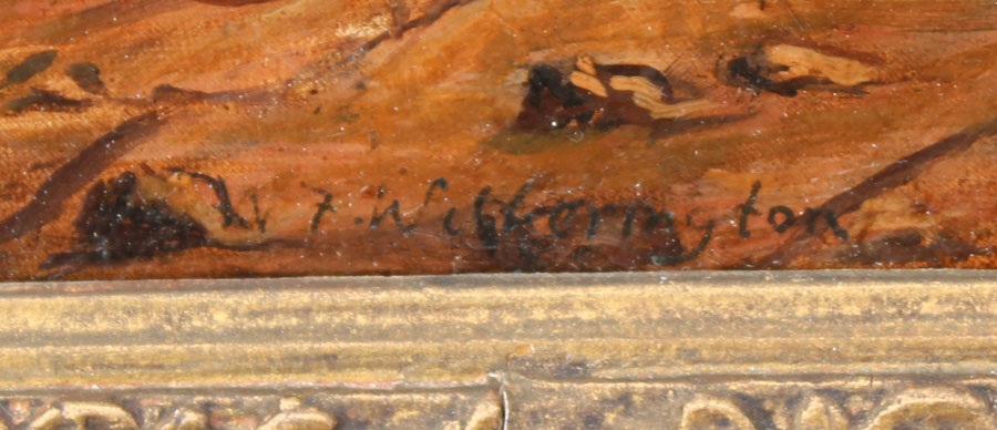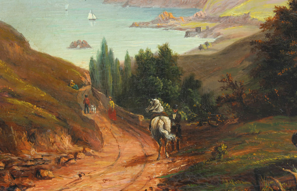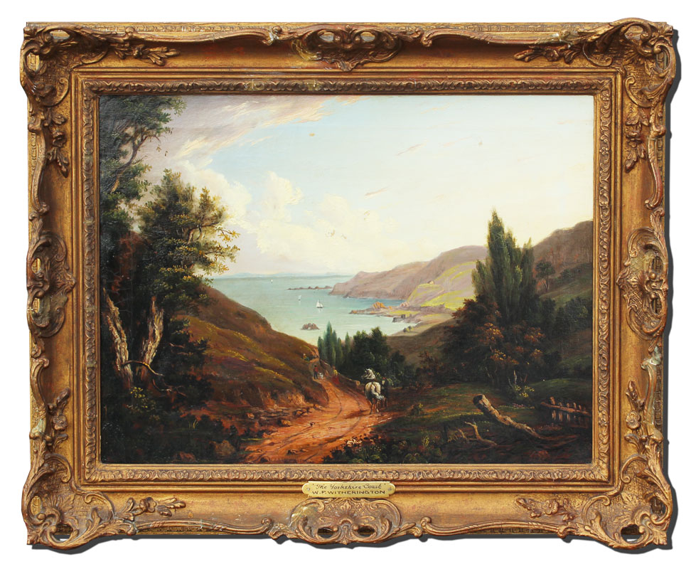 WITHERINGTON, William Frederick, (British, 1785-1865): ''Yorkshire Coast'', Coastal Vista with a Trail Leading Down to Water and Figures Traveling, Oil/Canvas, 18'' x 24'', signed lower middle margin, encased in carved and gilded gesso frame with repair and wear, 24'' x 30''.