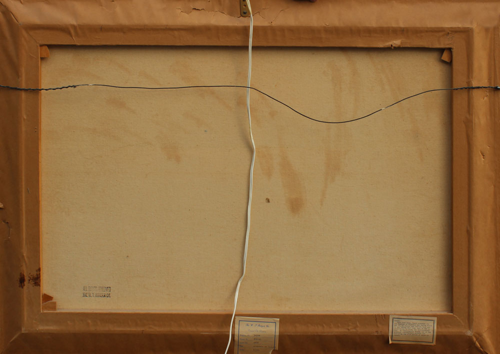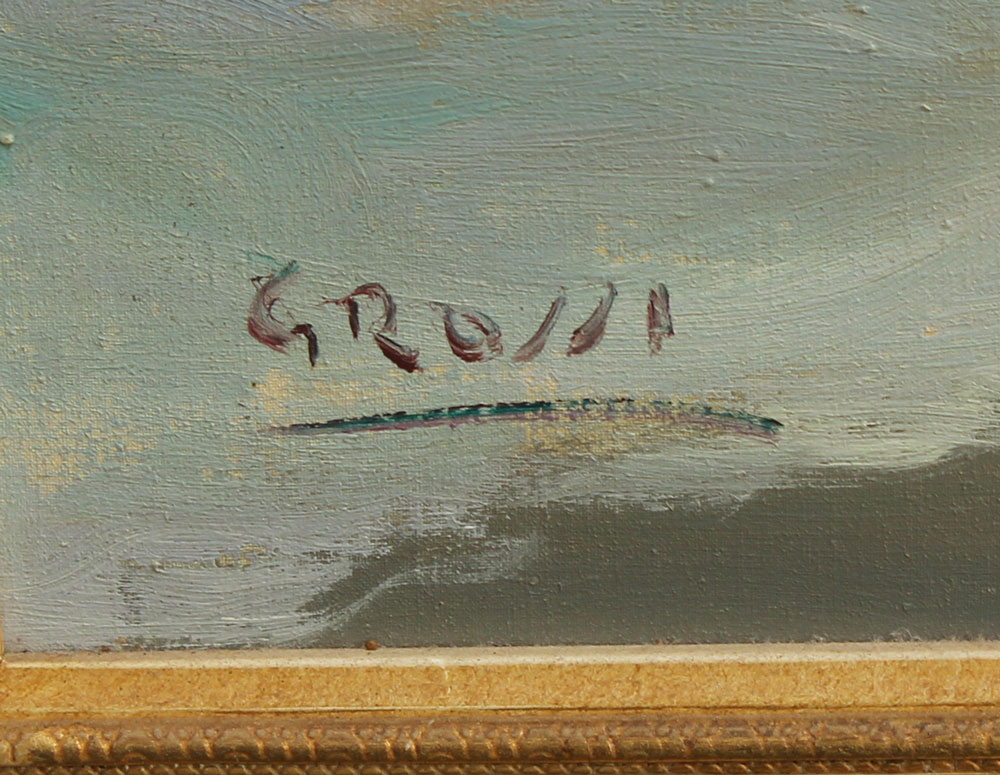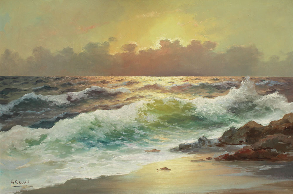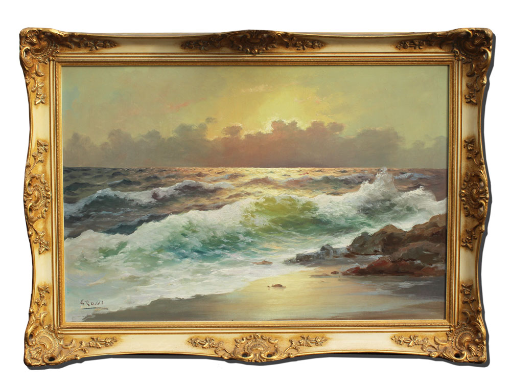COASTAL SUNSET WITH CRASHING SURF OIL ON CANVAS SIGNED GROSSI: 24'' x 36'', signed lower left, encased in a pierce carved and painted frame with wear, 30'' x 42''.