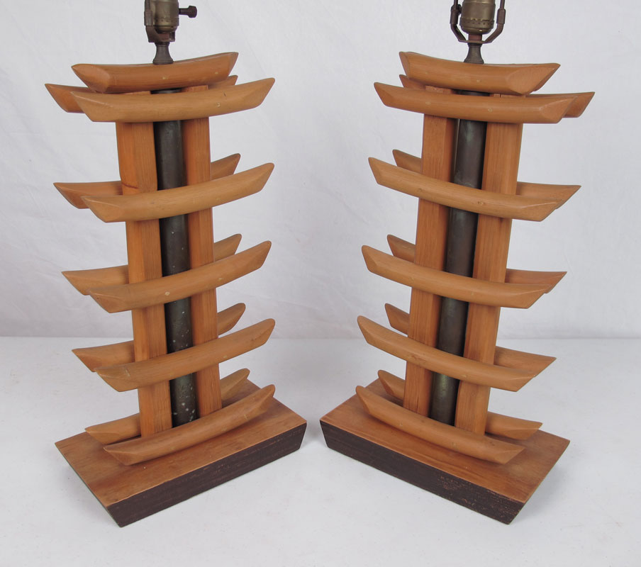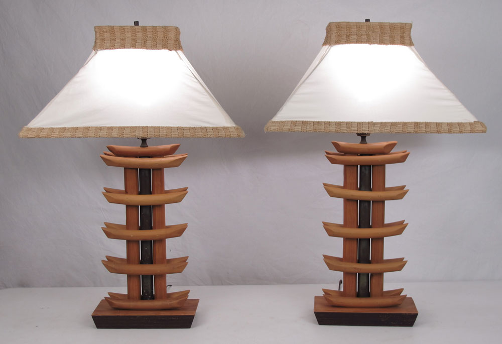 PAIR MID CENTURY BAMBOO LAMPS: Bamboo strips create a pagoda form body with central metal support. Unmarked. Overall 32 1/4'' h. x 11'' x 6''. Cloth shades measures 11'' h. x 14 3/4'' x 21 1/4''.