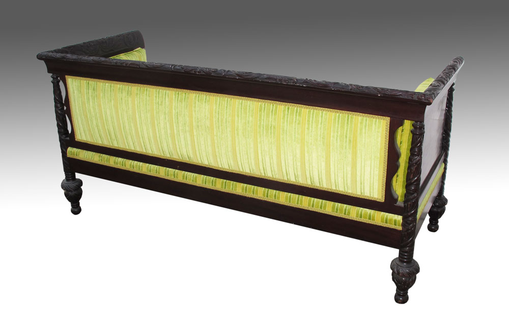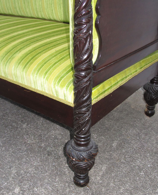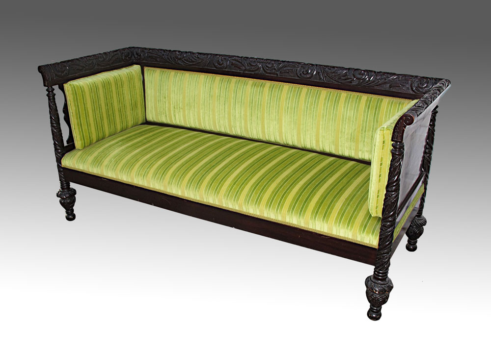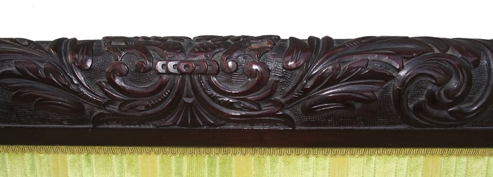 HORNER ERA CARVED MAHOGANY SOFA: Ornately carved straight back sofa, solid panel arm supports. Later upholstery and side cushions. 35 1/2'' x 75'' x 30''