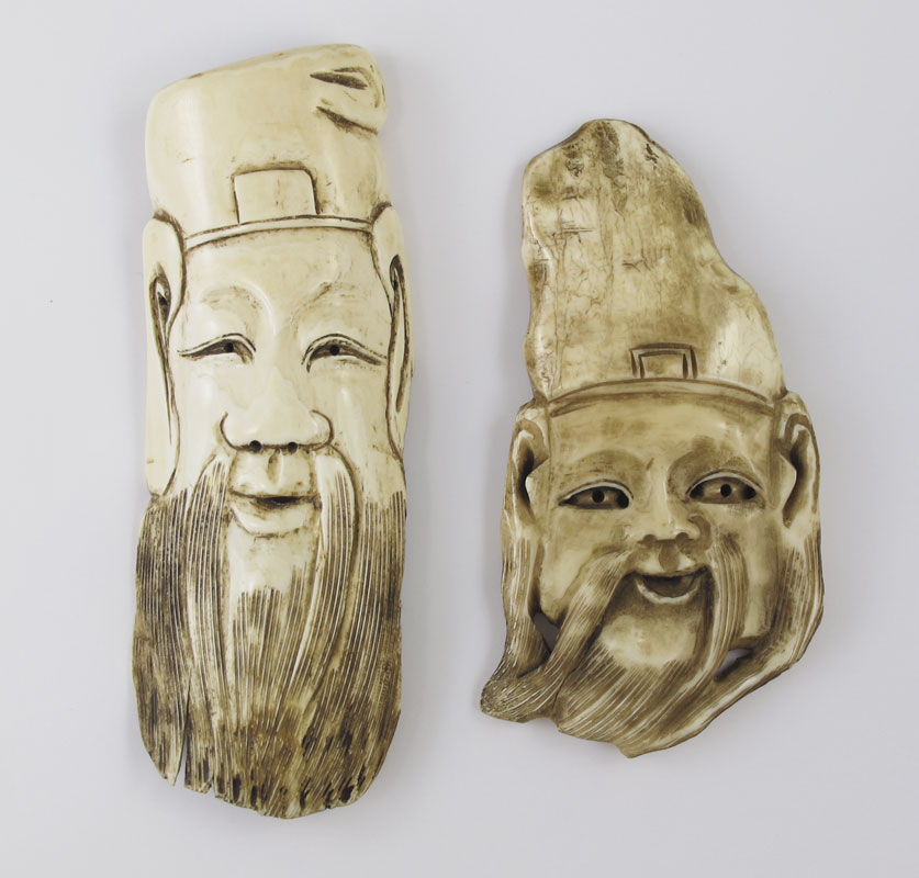 2 CARVED IVORY FACES OF CHINESE MEN: Carved and pierced from remnants of tusks, larger measures 5 7/8'' long, smaller 4 7/8''.
