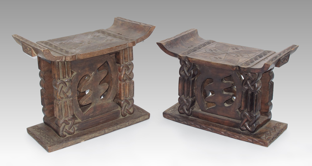PAIR OF CARVED AFRICAN ASHANTI CHAIRS: 19'' x 22 1/2'' x 12''