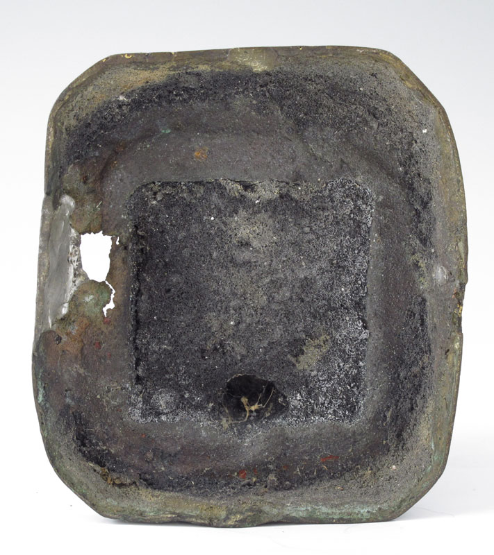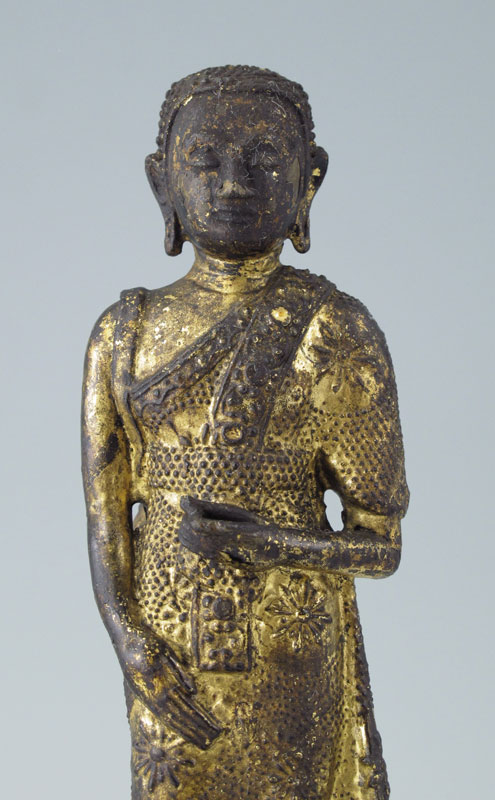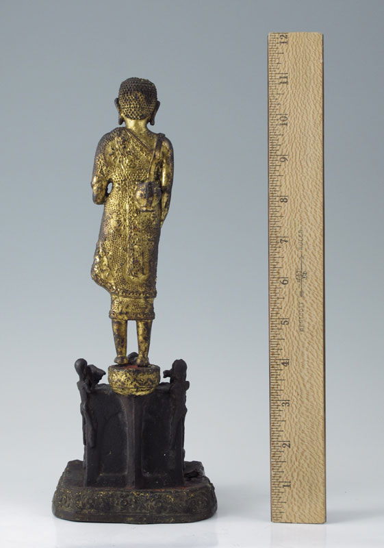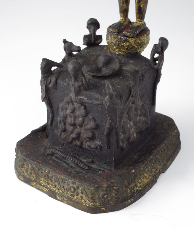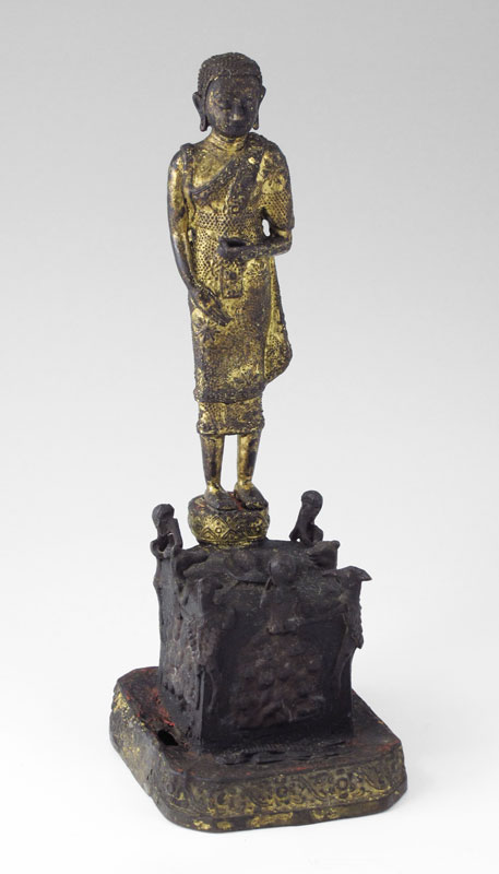 METAL BUDDHA LOOKING OVER THE THREE EVILS: 10 3/4''h. x 4'' x 4 1/2''. Loss to gilt finish, hole in metal at the base. Age unknown.