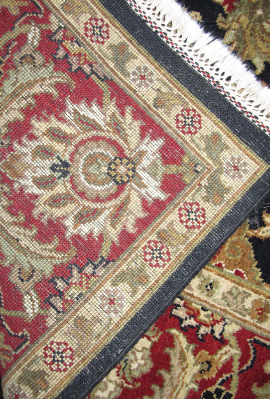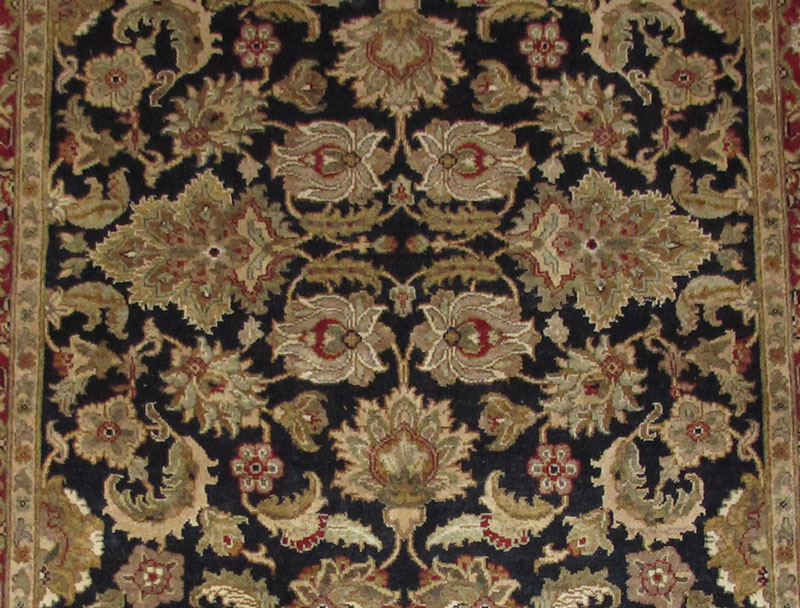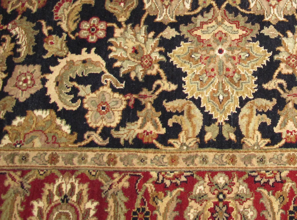 MODERN PAKISTANI-PERSIAN HAND KNOTTED WOOL RUG, 9'2'' X 6'2'': This attractive, formal looking rug has a traditional Persian design of palmettes, flower heads, and leaves, joined together by sinuous vines. The deep blue field makes the motifs stand out even though they are mostly in pastel shades including soft green, pale yellow, beige and red. The red ground border nicely frames the field. Condition is good.