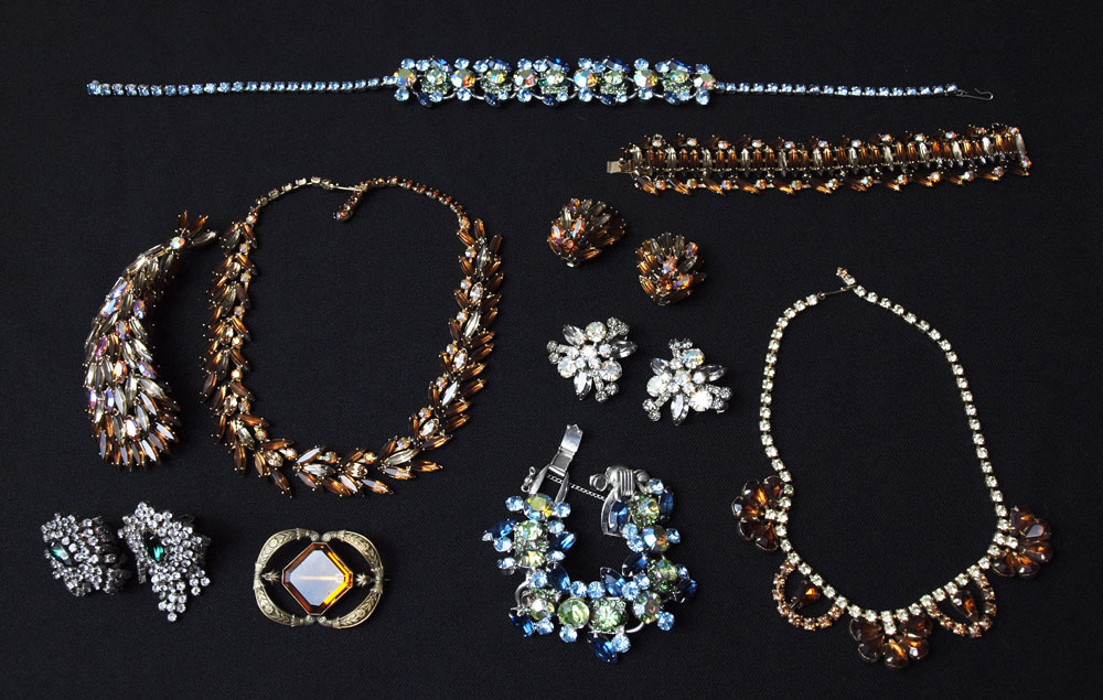 TRAY LOT OF RHINESTONE JEWELRY: 10 piece estate lot of sparkling colored rhinestones to include Regency Jewels.