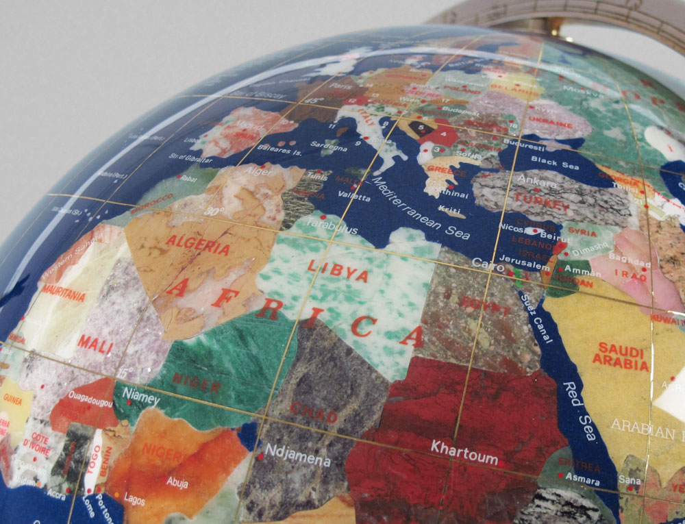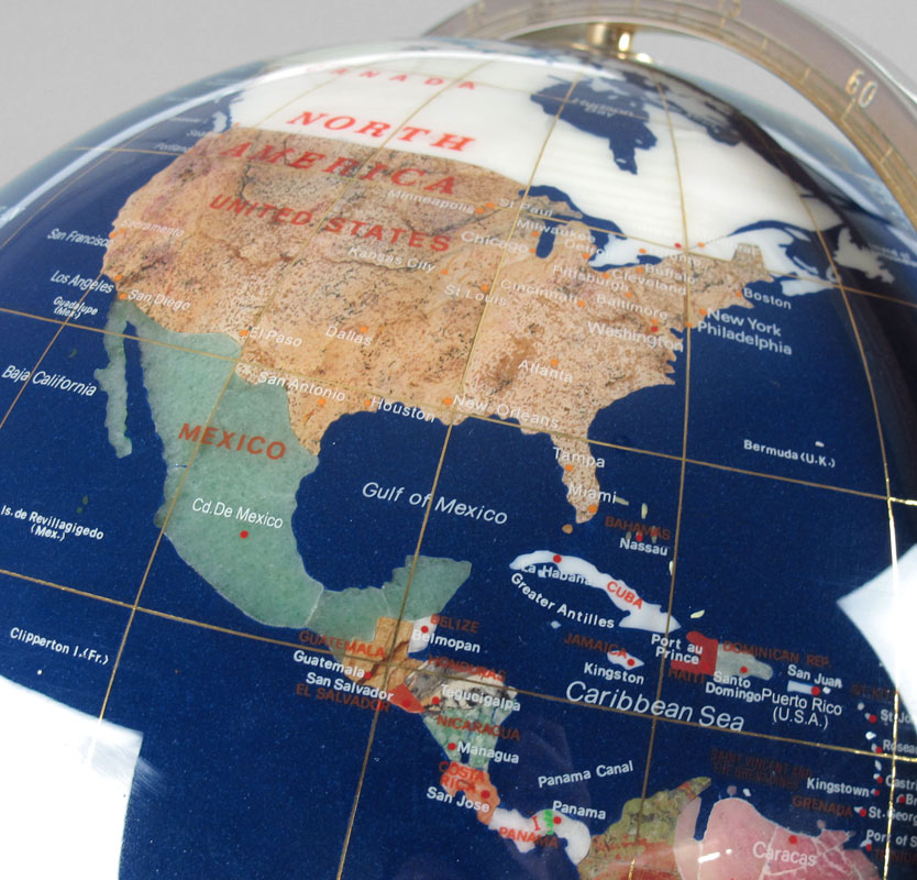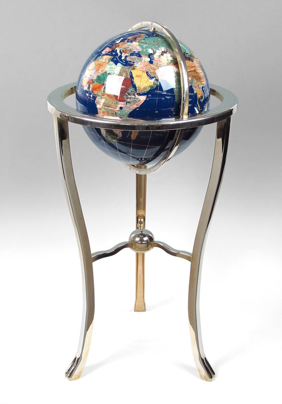 INLAY MULTI STONE FLOOR GLOBE: Multi stone floor globe with lapis seas, brass finish stand. Measures 36'' h. x 17 1/2''.
