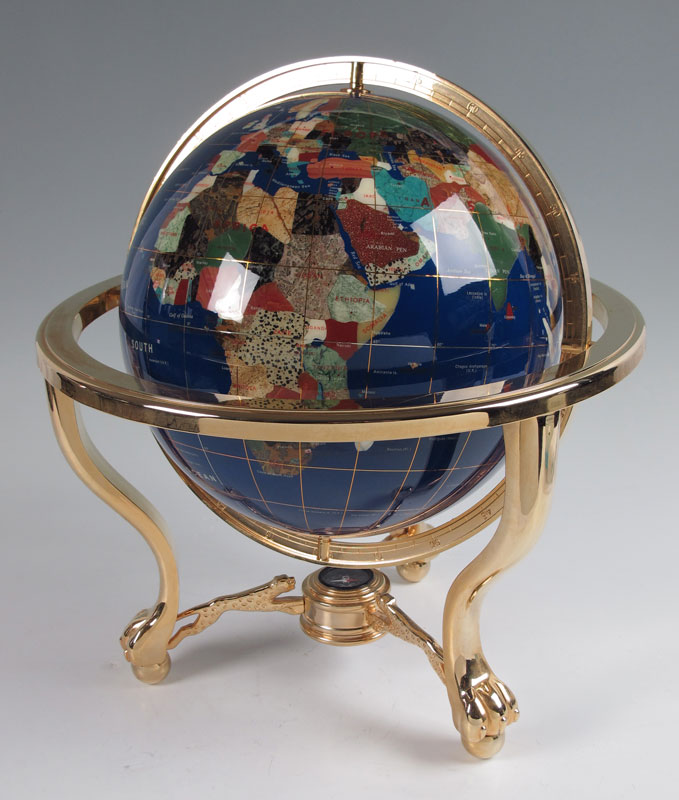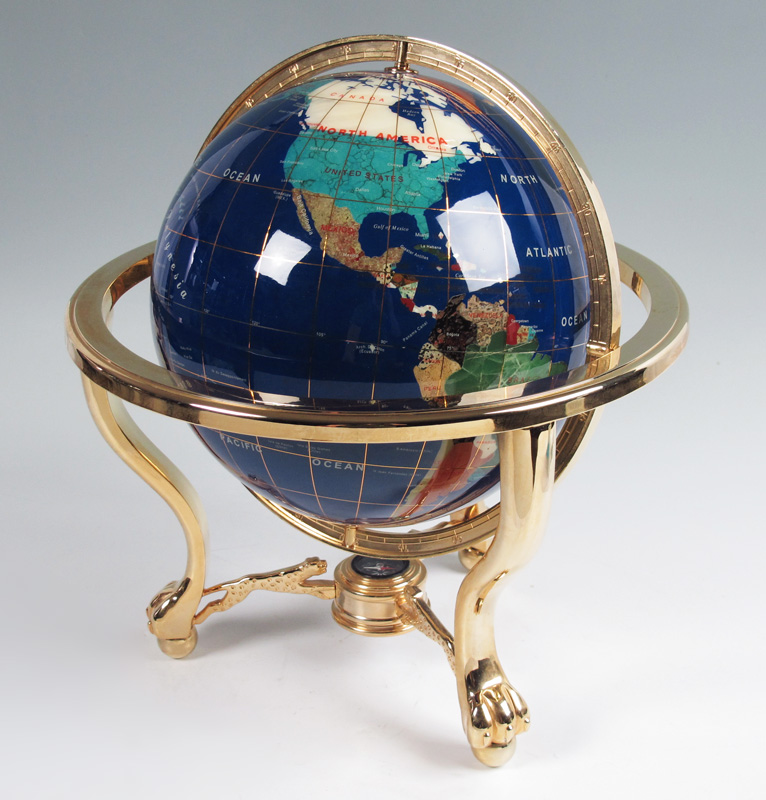 JERE WRIGHT MULTI STONE TABLE GLOBE: Table top multi stone globe, lapis seas, with brass stand, working compass on base. 19'' h. x 19 1/2''.