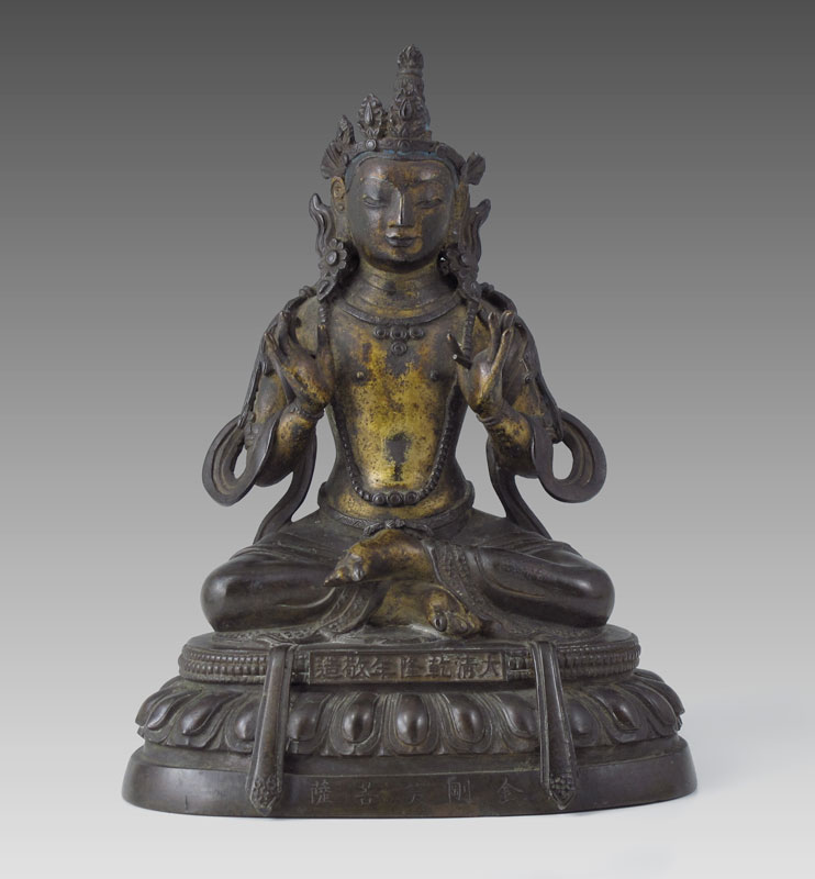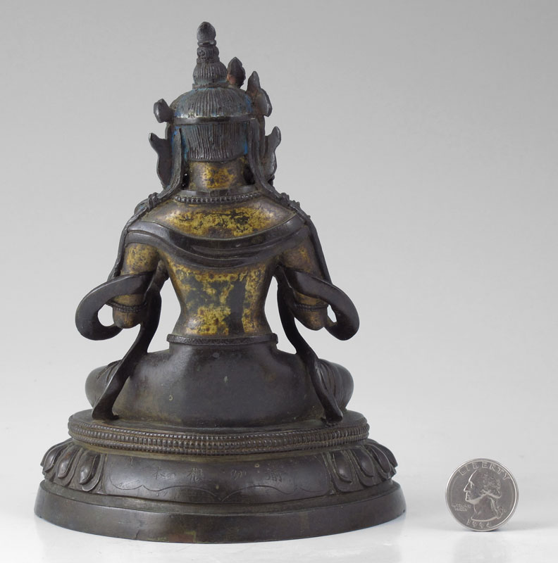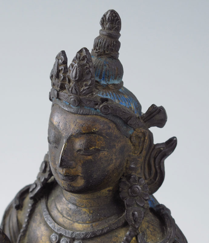 BRONZE TIBETIN BRONZE BUDDHA: 7 1/2'' tall. Loss of one point on the head piece. Age unknown.