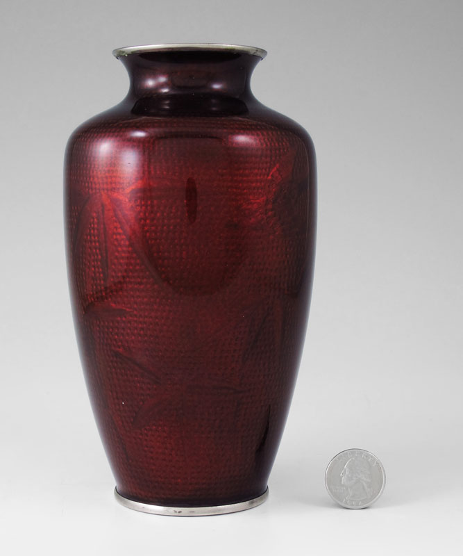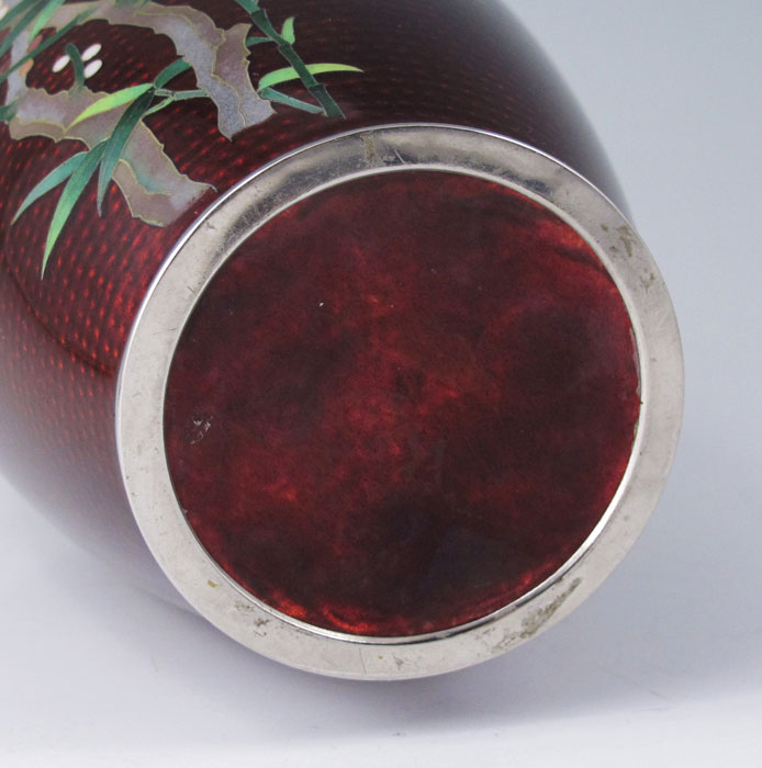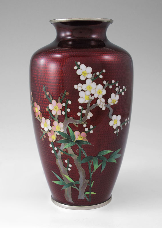 CLOISONNE RED FLORAL VASE: Branch and flower motif, unsigned. Measures 7 1/4'' h. x 4''.