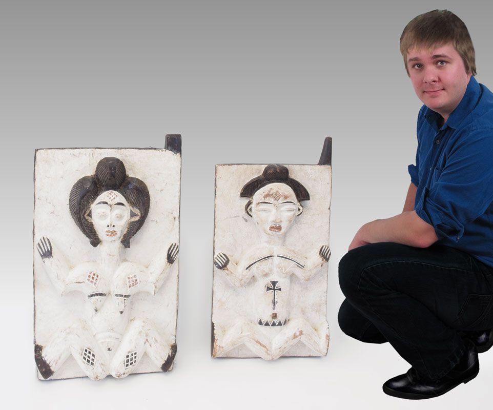 CARVED AFRICAN PANU DOOR PANELS: 25'' x 15'' x 3'' and 24'' x 12 1/2'' x 3''