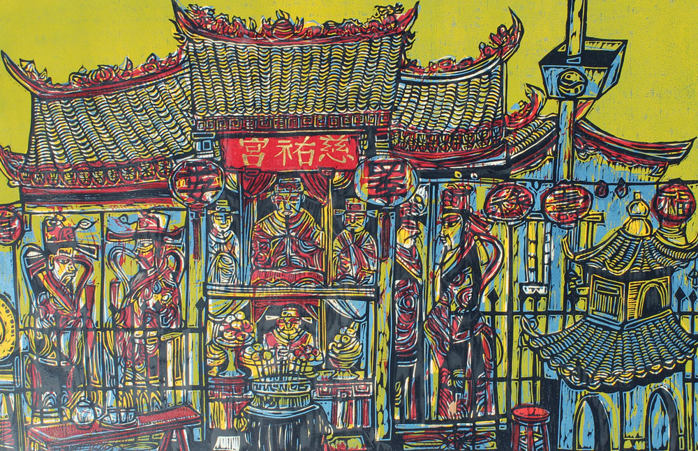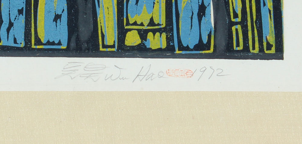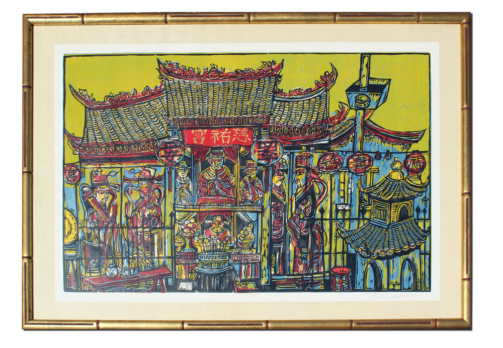 WU HAO ORIENTAL VILLAGE WOODBLOCK: 20 1/2'' x 31'', signed lower right, dated 1972, gilded faux bambo frame, 25'' x 36 1/2''.