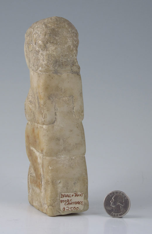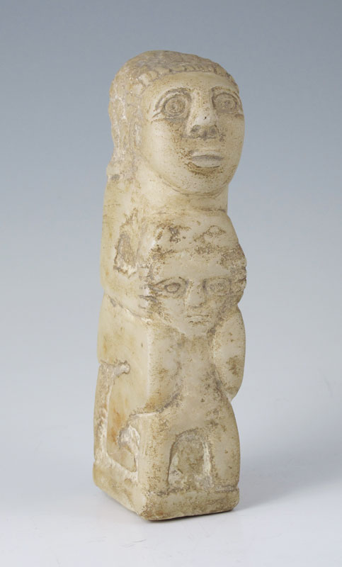 CARVED STONE FIGURE OF BA'AL HAMMON & TANIT: Figure of Phonecian god Tanit and Ba'al Hammon, chief god of Carthage. Measures 7'' h. x 2 1/2'' x 1 3/8''. Age unknown.