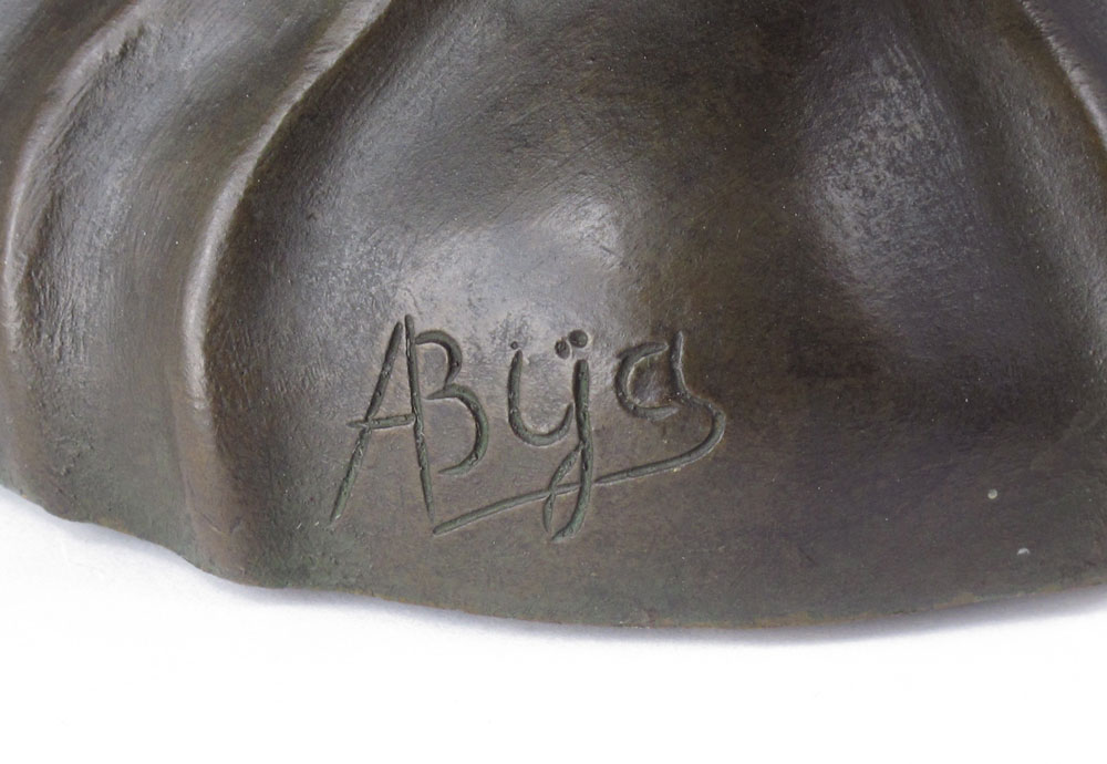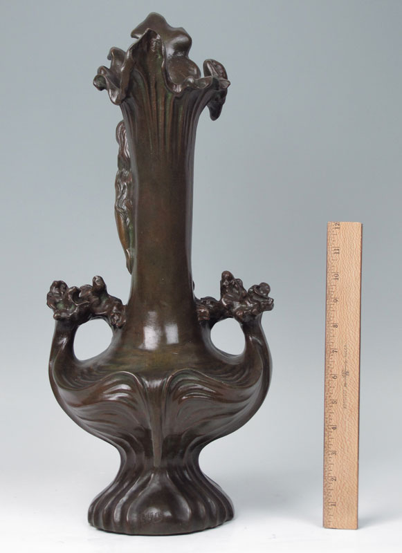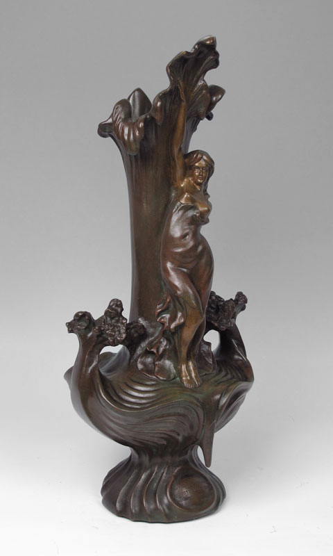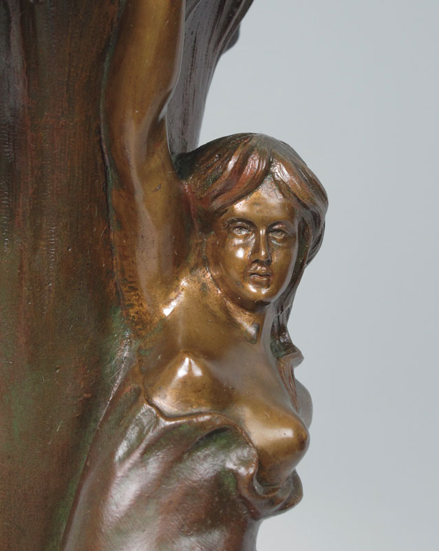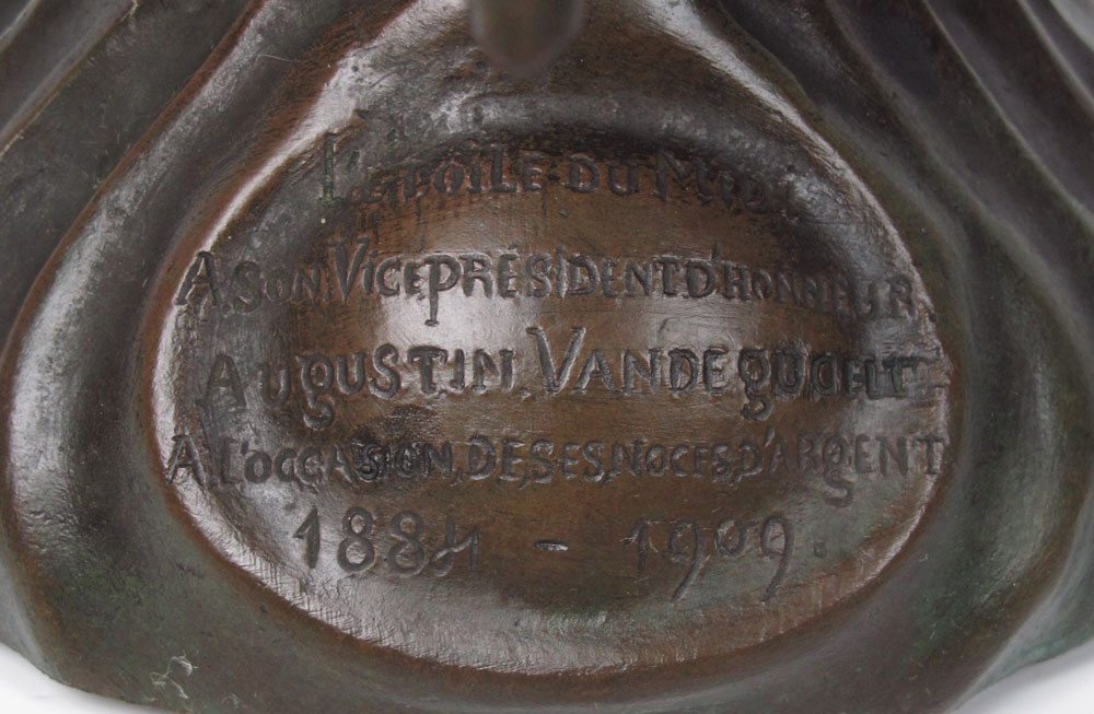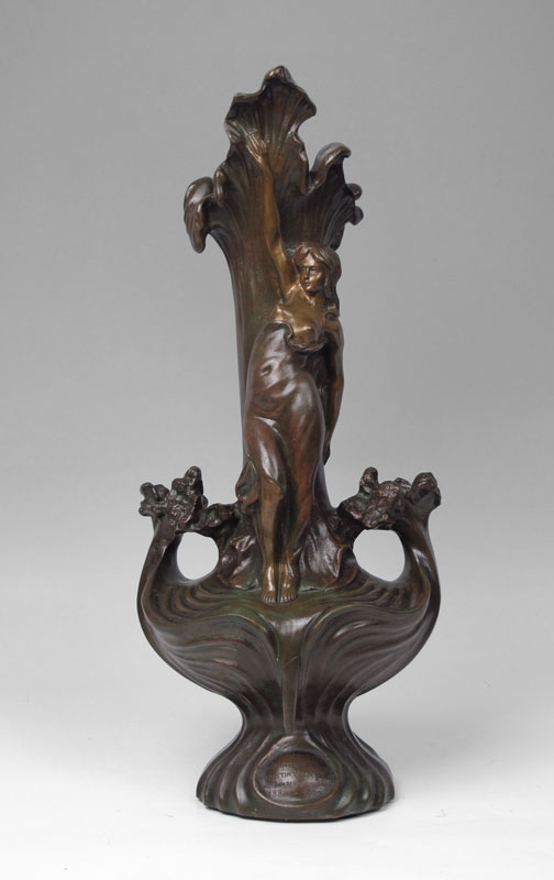 FRENCH ART NOUVEAU FIGURAL BRONZE VASE: Figural maiden with floral motif, presentation in lower reads ''L'Etoile du Midi A. Son. Vice President d Honneur Augustin Van De Gucht A. Loccasion, de, ses, Noches, D' Argant 1888-1909''. Signed A. Bya? on base. Measures 22'' h. x 9 1/2''.