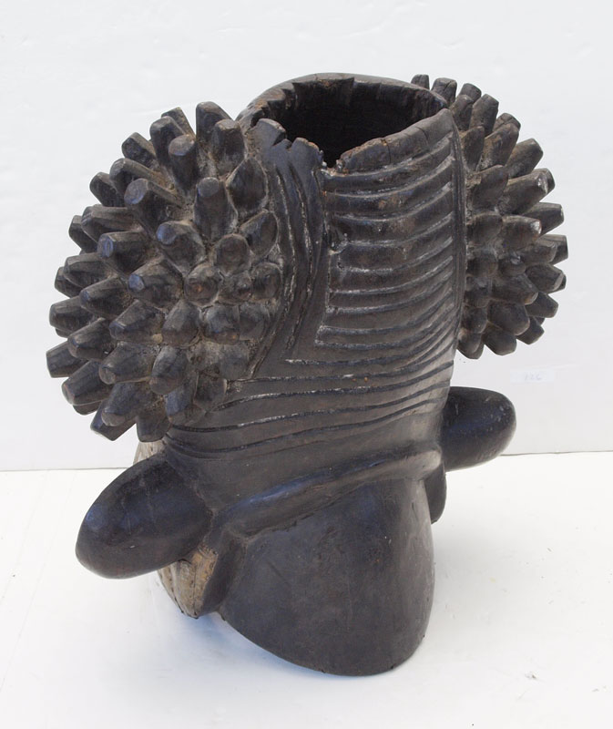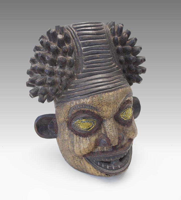 CARVED AFRICAN BAMILEKE MASK WITH BEADS AND APPLIED METAL HEADDRESS: 16'' x 15'' x 12''
