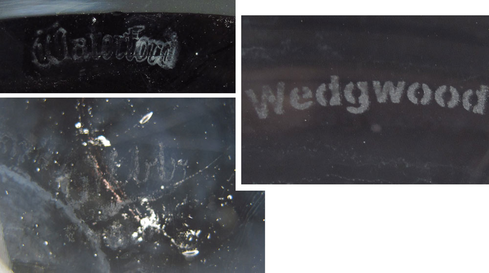 6 PIECE QUALITY CUT GLASS COLLECTION: To include 1) Waterford tall decanter, 13 1/4'' h. x 4 1/2''. 2) Unmarked square decanter, note chips to stopper, 11'' h. x 3 3/4''. 3) Wedgwood ships decanter, 10 3/8'' h. x 7 1/2''. 4) Webb fruit bowl, 5 3/4'' h. x 9 1/4''. 5) Waterford center bowl, 3 1/2'' x 8''. 6) Waterford Church, 4'' h. x 4 1/4'' x 2 3/4''.