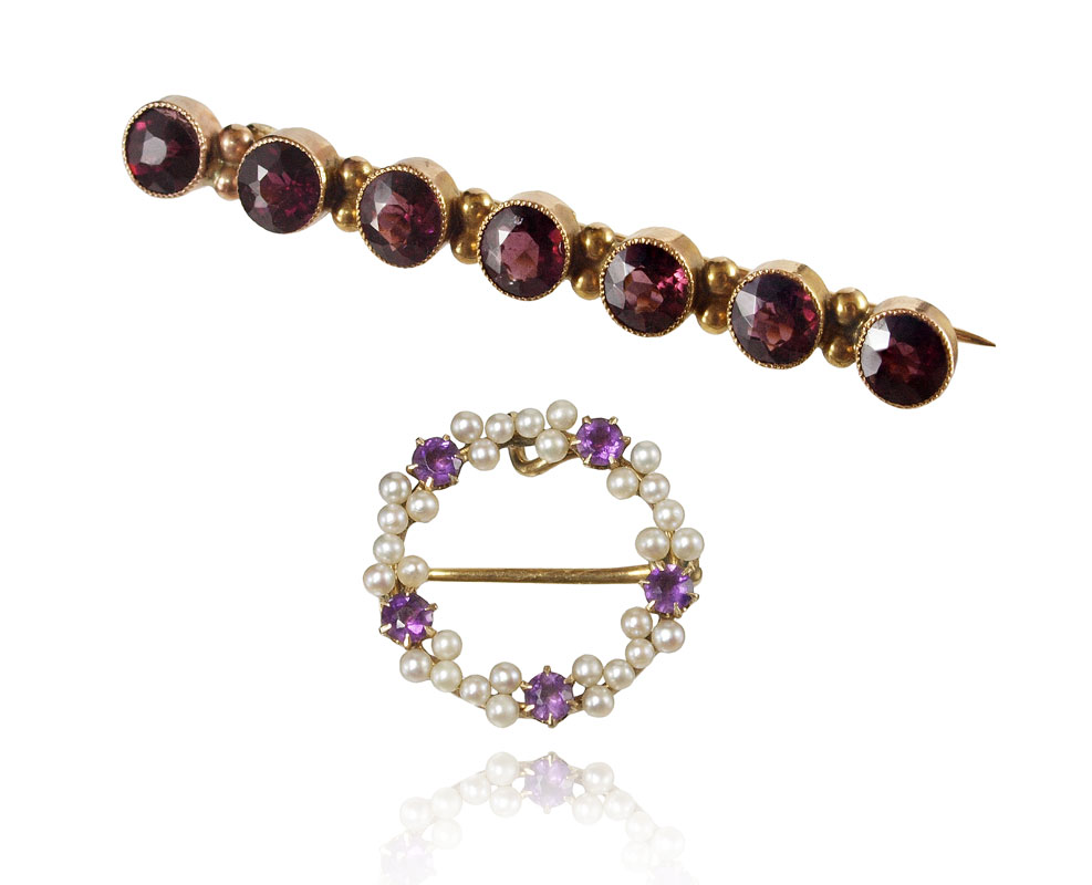 2 VICTORIAN PINS: Diminutive 14K yellow gold seed pearl and amethyst circle watch pin. And a 9K yellow gold bar pin set with purple/red stones of unknown origin, 2''l. 9K weight: 2.7 grams. 14K weight: 3.2 grams.