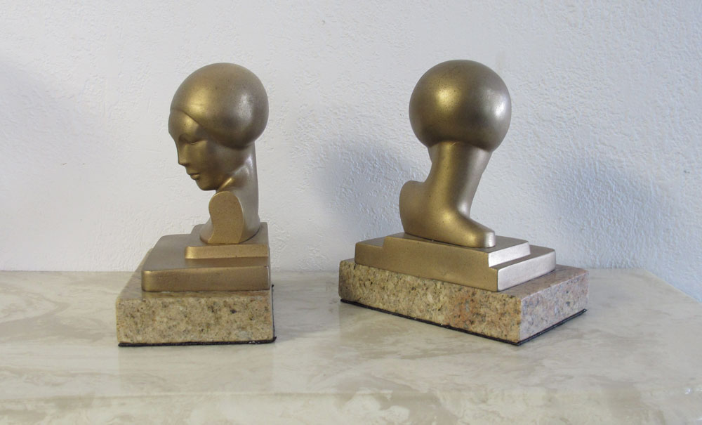 ART DECO FRANKART BUST BOOKENDS: Figural female busts in classic art deco styling with marble bases. Marked under bust. Measures 7'' h. x 6 1/8'' x 4''.