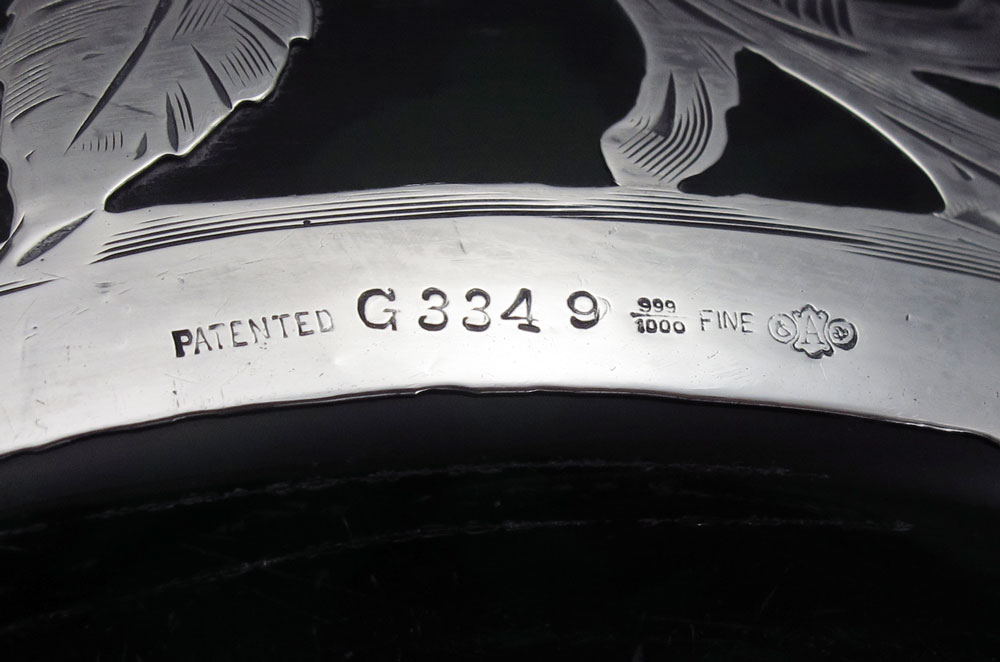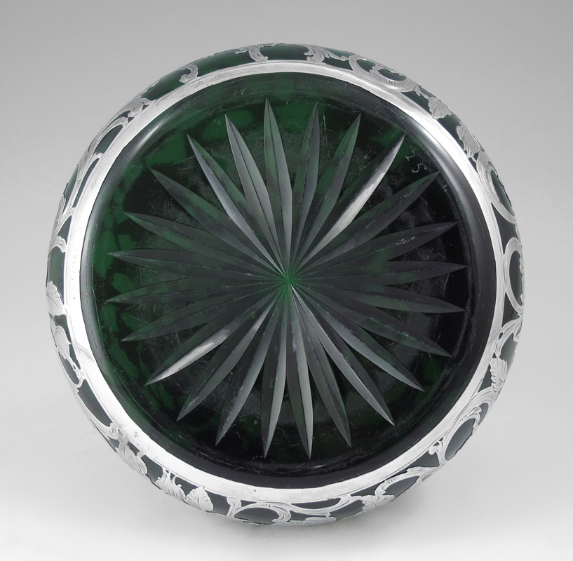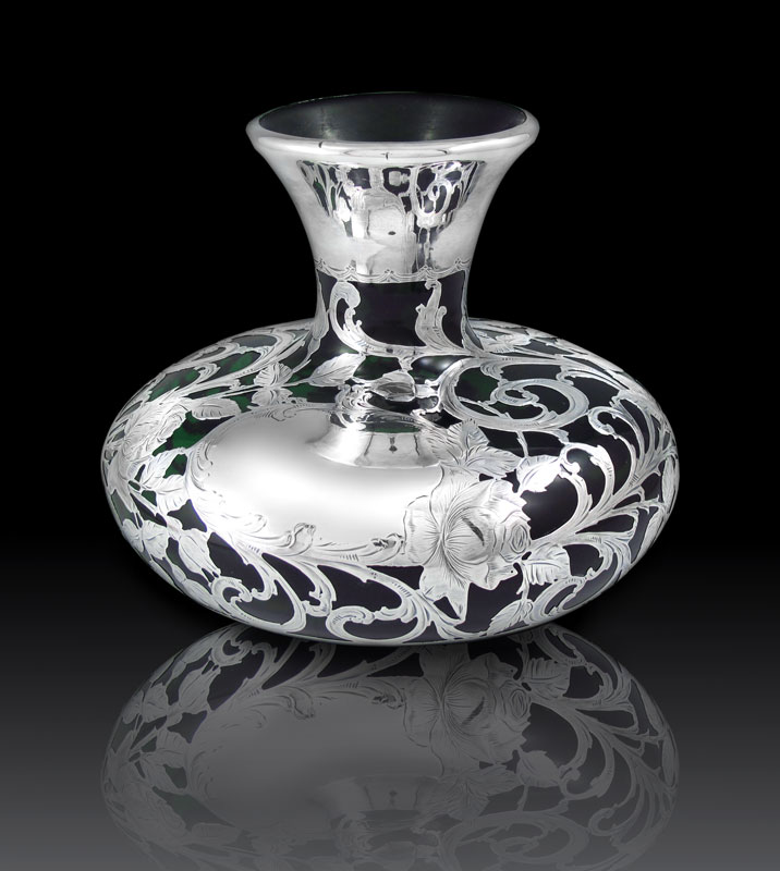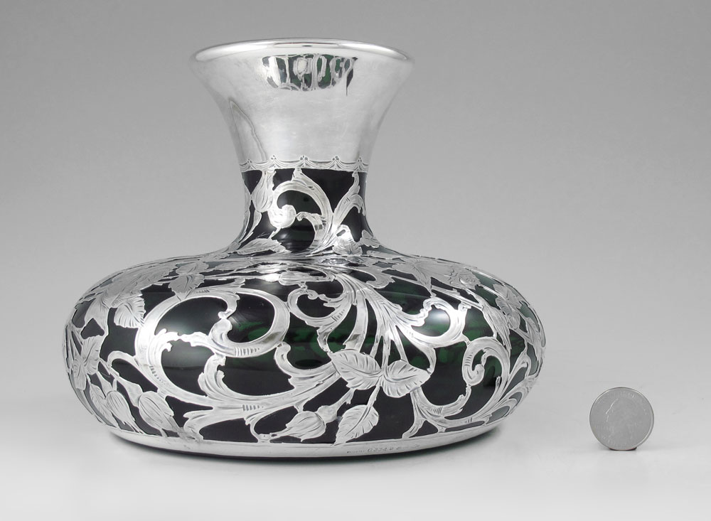 ALVIN STERLING SILVER OVERLAY CARAFE: Dark green glass under Alvin .999 pure silver overlay in a floral motif. Glass etched with 25, overlay marked Patented G3349, 999/1000 Fine with Alvin hallmark. Measures 6 3/4'' h. x 8'' dia..
