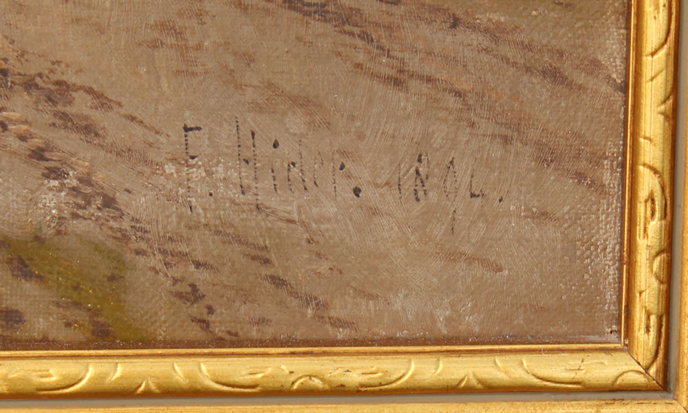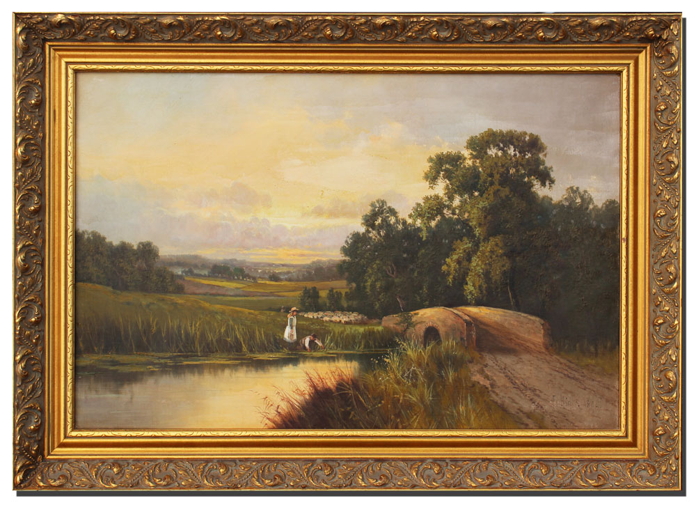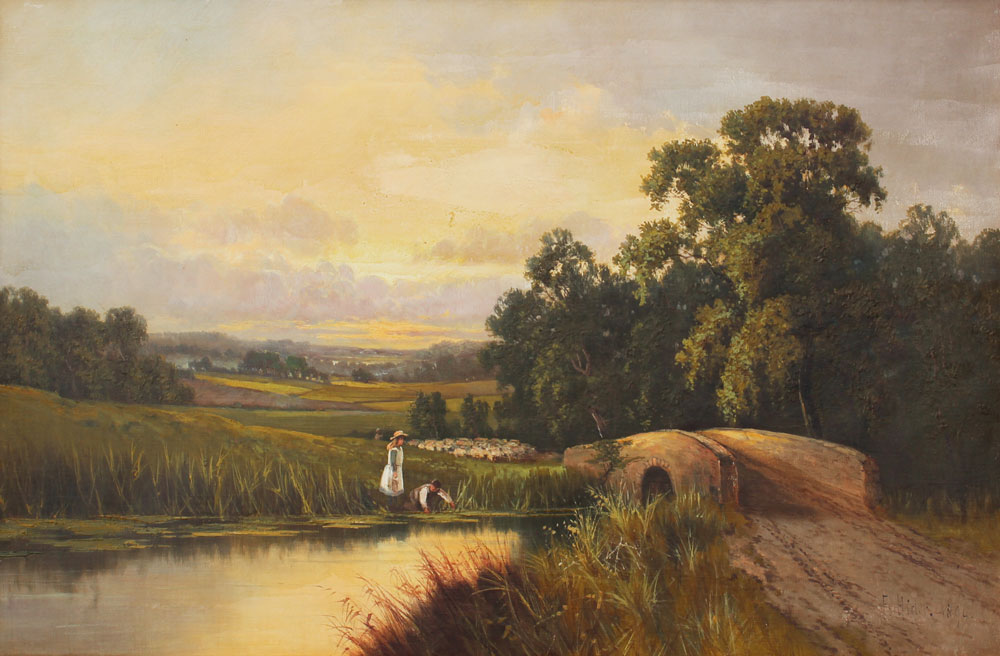 HIDER, Frank, (British, 1861-1933): Panoramic Landscape with Figures by a Covered Bridge with Small Stream, Oil/Canvas, 19 3/4'' x 29 1/4'', signed lower right, dated 1894 lower right, gilded frame, 26'' x 36''.