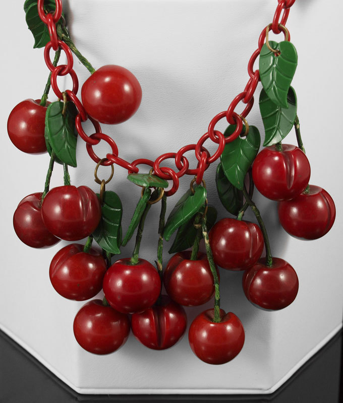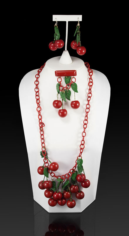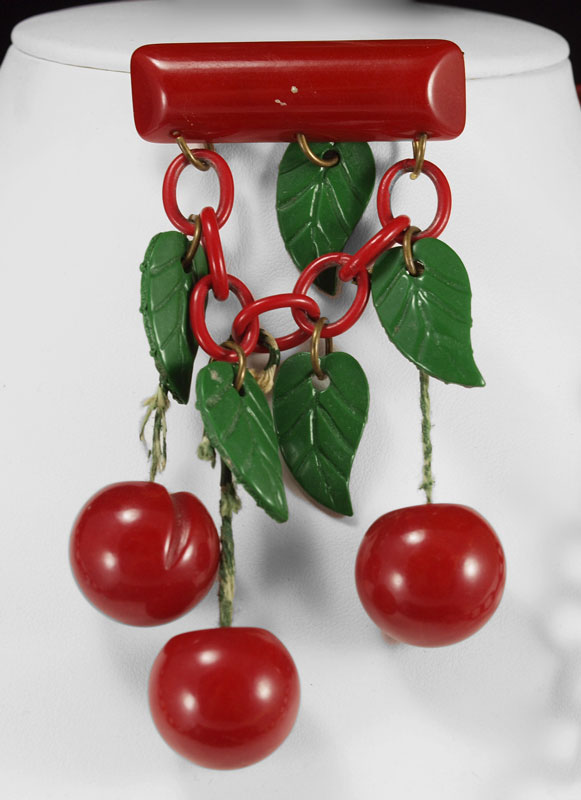 BAKELITE RED CHERRY NECKLACE, PIN, AND EARRINGS: Red chain necklace of 14 cherries, approx. 26''L. The bar pin with 3 cherries, 2'' wide. The earrings each with 2 cherries, 3''L.