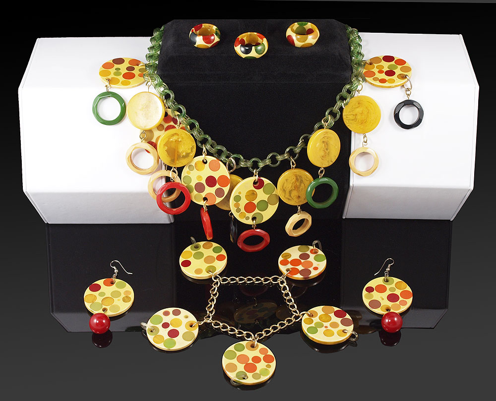 POLKA DOT BAKELITE SUITE: The 18'' green chain necklace with dot and solid disc charms along with rings. The bracelet with 6 dot charms. Matching earrings. The dot discs all measure approx. 1 1/2'' dia. The 3 rings are sizes 5 1/2, 7, and 7 1/2.