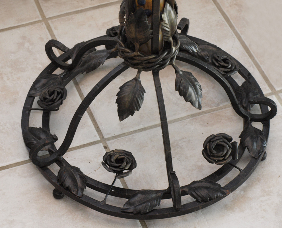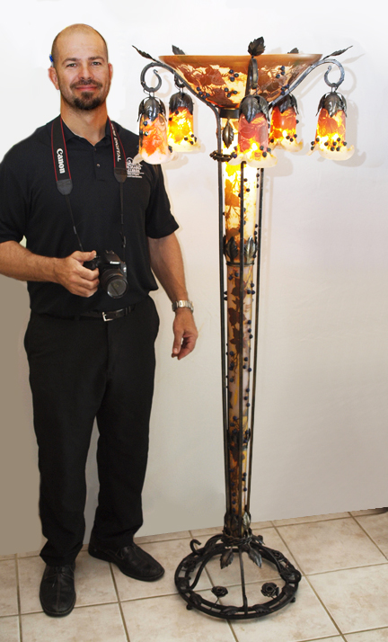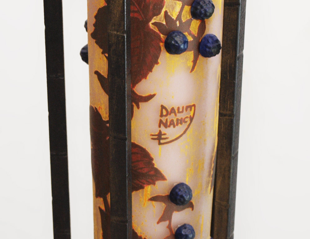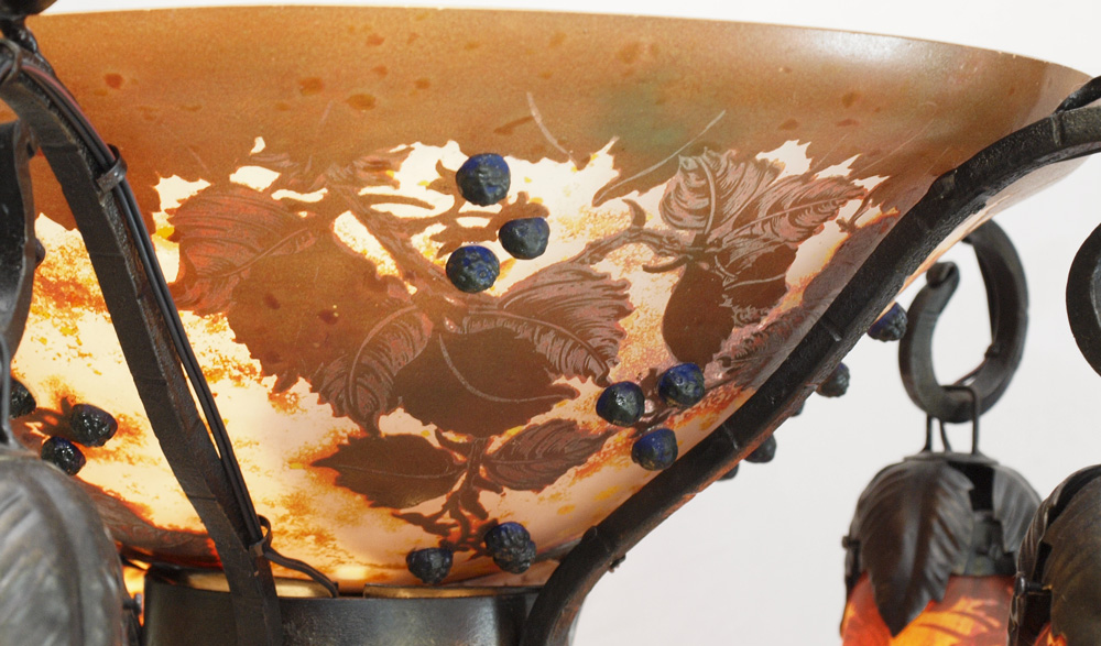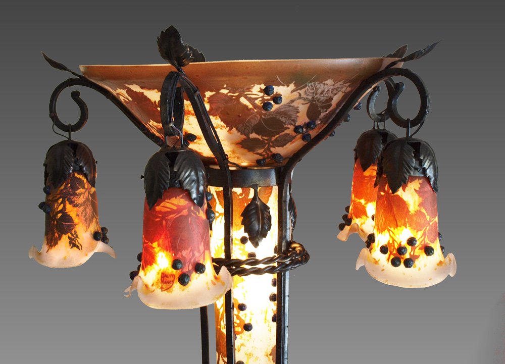 CAMEO GLASS FLOOR LAMP IN THE STYLE OF DAUM: Grape vine motifs all over with center shade, 5 hanging shades, lighted body supported by iron frame and cast floral motif base. Signed Daum Nancy on body, later 20th century production. Measures 68 3/4'' h. x 22'' dia. overall.