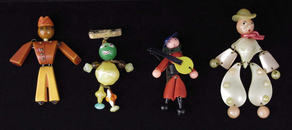 4 JOINTED PEOPLE PINS: 1) Bakelite bell hop, 3.5'' 2) Pink and cream cowboy, 4 1/2''. 3) A lady guitarist wit bending knees, 3 1/2''. 4) Citrus colored clown, 3''.