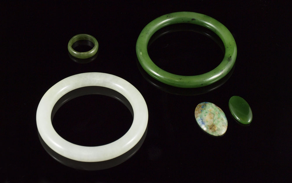 ESTATE LOT OF NEPHRITE JADE JEWELRY: To include, Palest of grey green bangle, 2 3/8'' interior, 3 1/4'' dia., small natural crevasse at amber spot; Dark green bangle, 2 1/2'' interior, 3 1/8''dia.; Green ring, size 9, muted finish; 2 cabochon stones - ready for your use, Dark green approx. 1 1/8'' x 5/8'' and Variegated, lovely mix of colors to include blue, green, brown and white, 1 5/16'' x 7/8''. Sold as a lot.