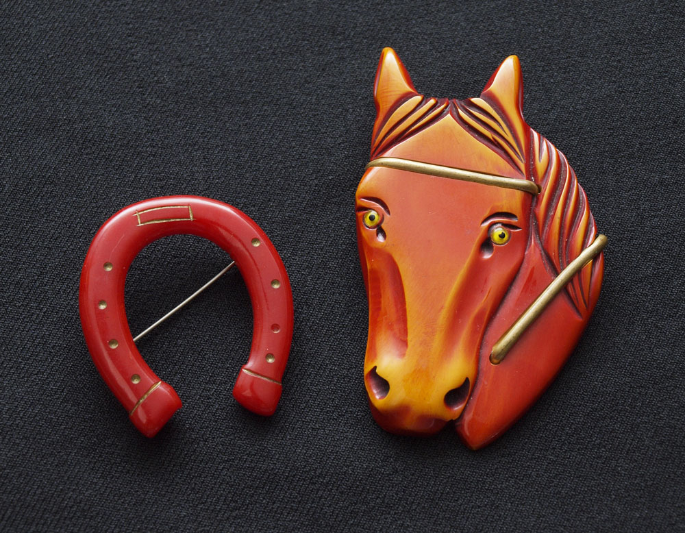 2 PIECE BAKELITE HORSE HEAD AND HORSESHOE PINS: 1) Resin washed red over butterscotch carved horse head, 3 1/2''L. 2) Red horse shoe pin with incised carving, 1 3/4''L.