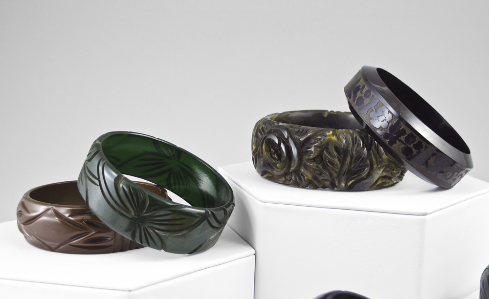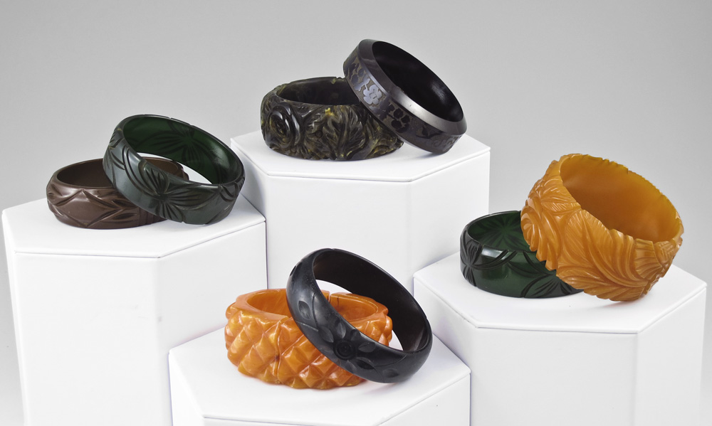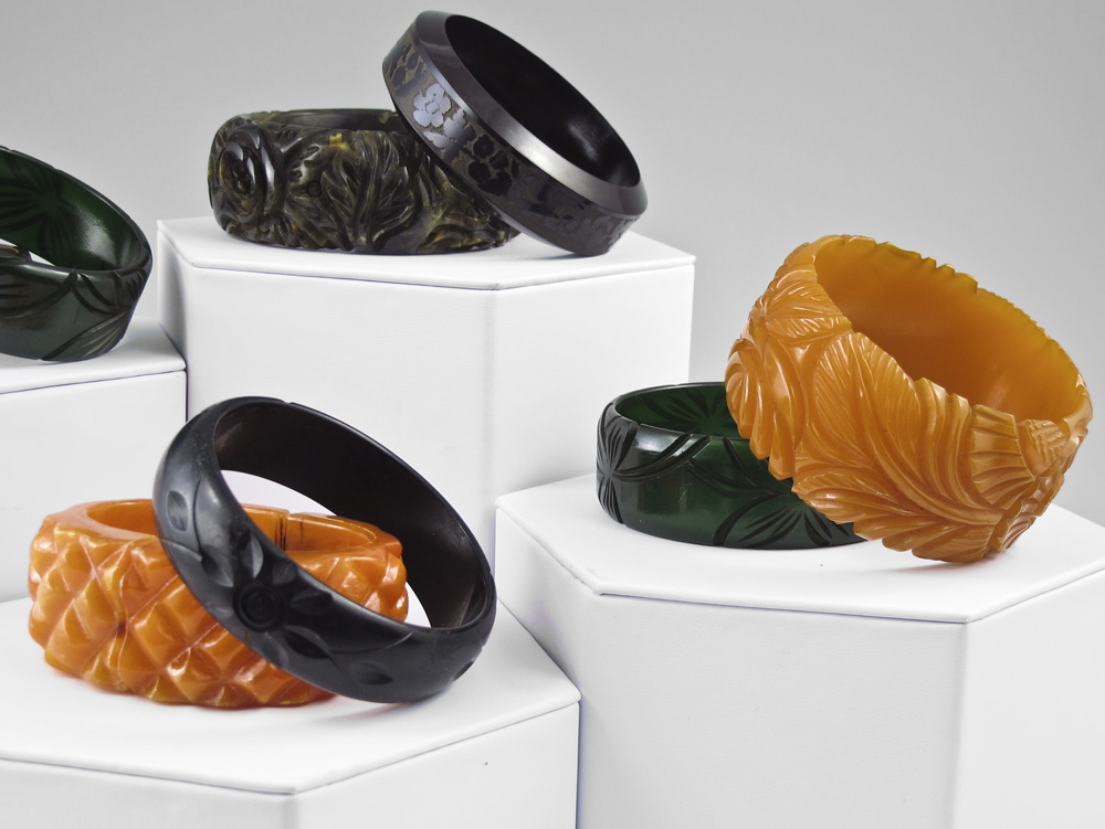8 CARVED BAKELITE BANGLE BRACELETS: Orange, black, green, and brown. Each 2.5'' interior diameter. The waffle carved orange bracelet is the only hinged one in this lot.