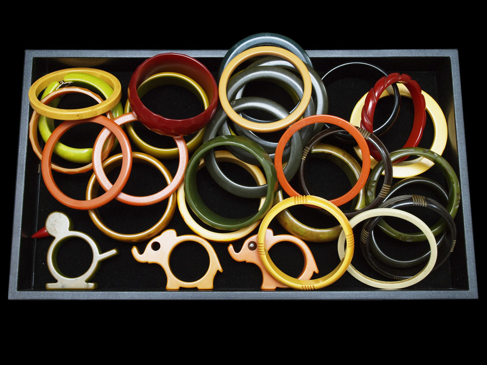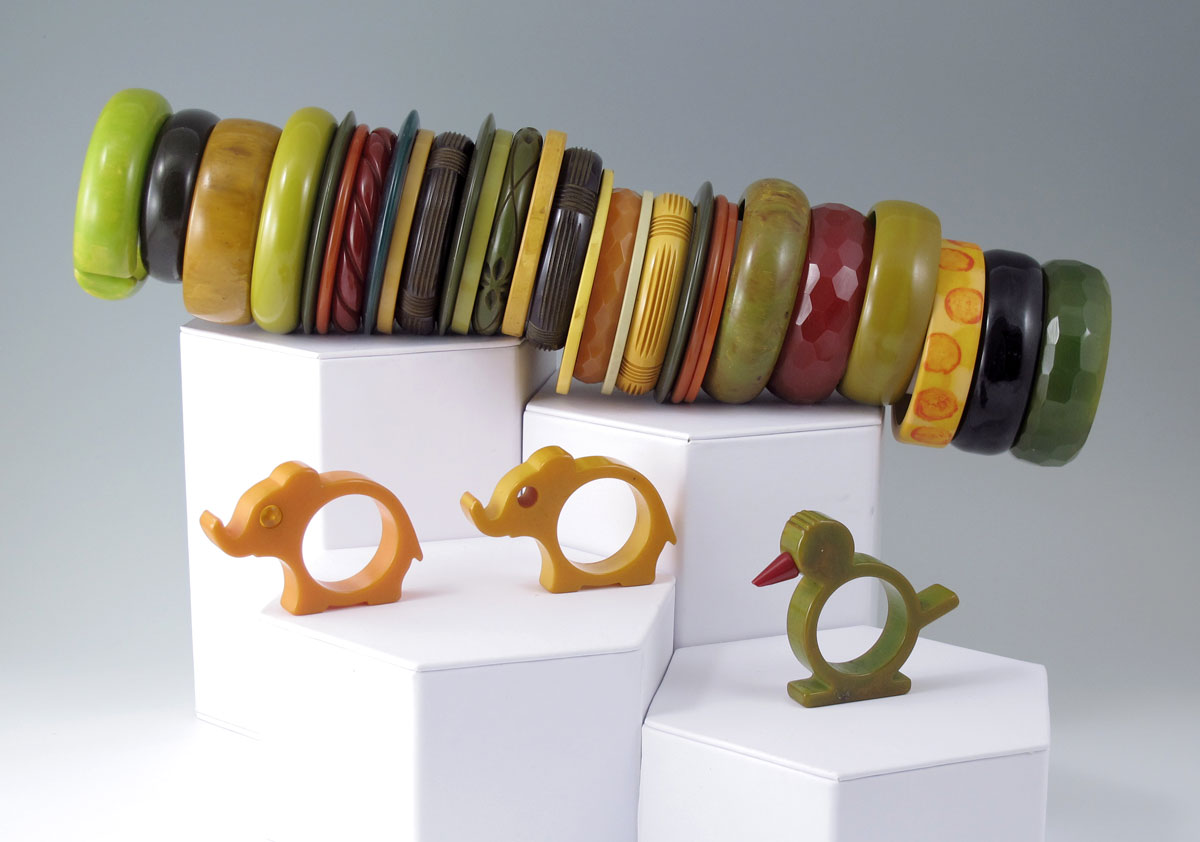 MEGA LOT BAKELITE BANGLES AND NAPKIN RINGS: 28 bangle bracelets and 3 animal napkin rings. The bracelets are carved, flat, fat, and faceted.