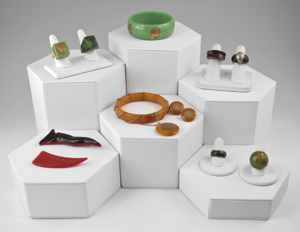 BAKELITE, COIN, AND PLASTIC JEWELRY: Butterscotch bangle bracelet wrapped in chain and having a single disc charm, with matching earrings. A laminated black on red horn pin, 3.5''L. A solid red horn pin, 5 rings sizes 5-7., and a ring and bracelet with inset coins.