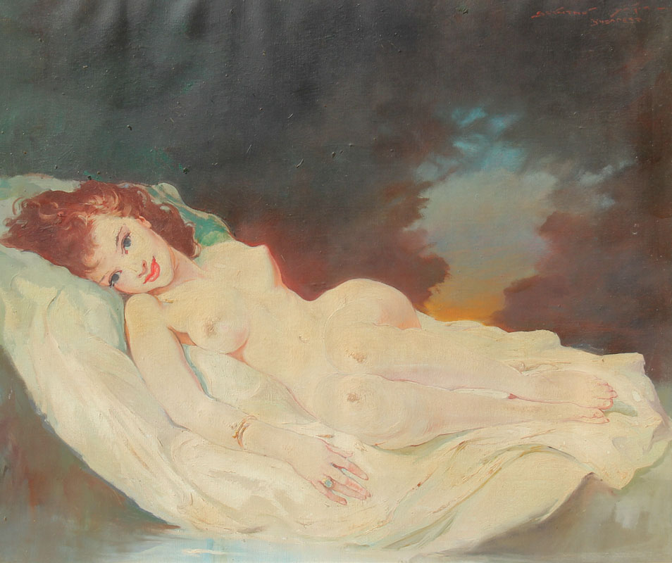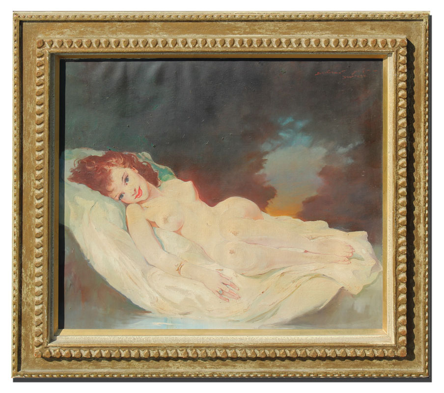SZANTHO, Maria, (Hungarian, 1898-1984): Reclining Red-Headed Nude Beauty, Oil/Canvas, 20'' x 24'', signed upper right Szantho Maria Budapest, period carved and painted gesso frame, 26 1/2'' x 30 1/4''.