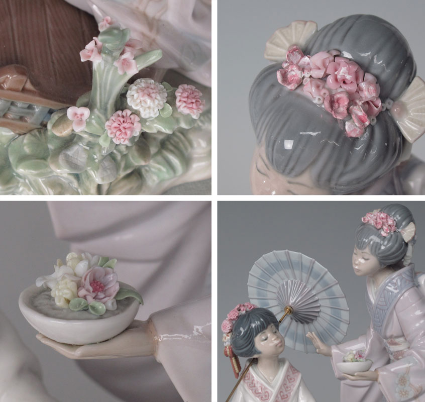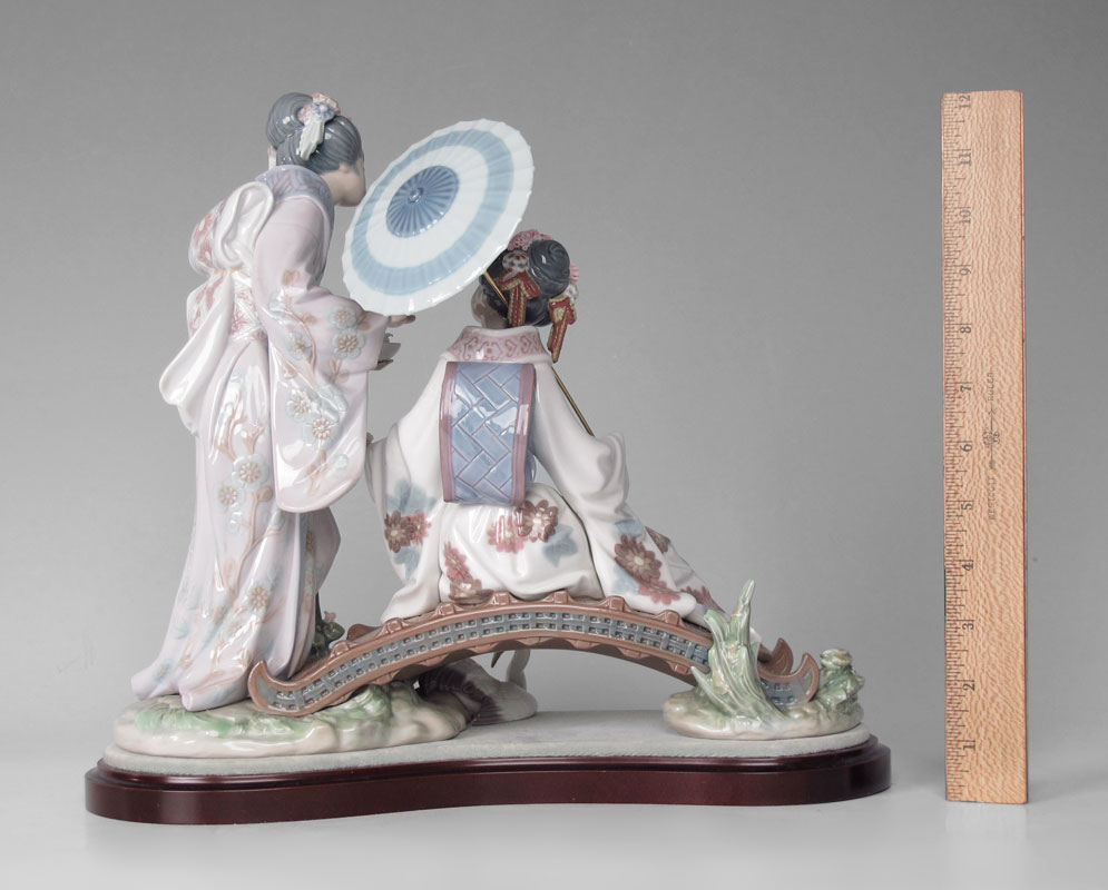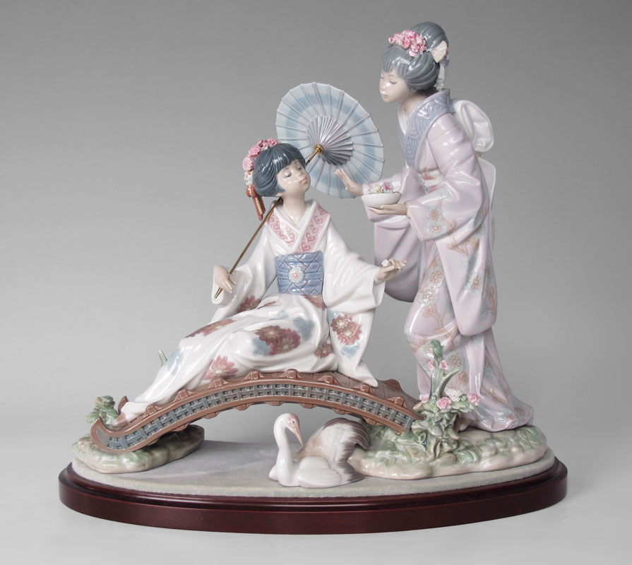 LLADRO FIGURINE, ''SPRINGTIME IN JAPAN'': #1445, Glazed, Salvador Debon sculptor, issued 1983, approx. 12'' x 13 1/2''. With original wood and velvet stand, 14 1/4'' x 6 1/2'' x 1 1/4''. Current Lladro website retail price $2500.