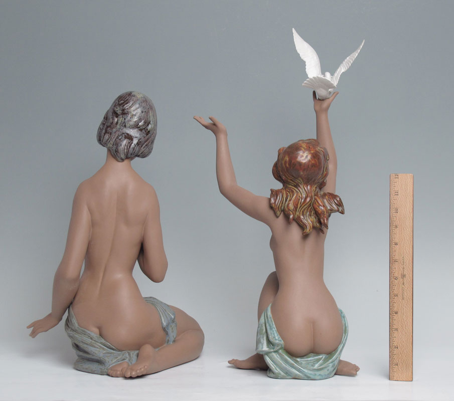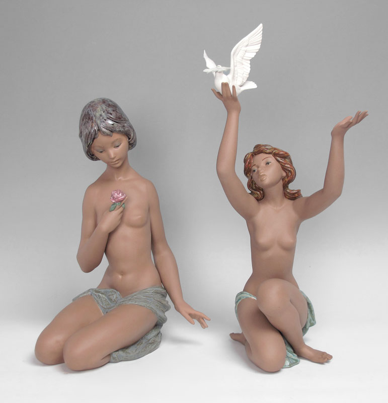 TWO LLADRO GRES FIGURINES BY SALVADOR DEBON: 1) PEACE OFFERING #3559, issued 1985, approx. 21''h.; 2) NUDE WITH ROSE #3517, issued 1978 retired 2004, approx. 18''h.