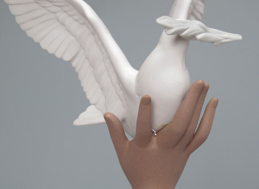 CONDITION: Both pieces have been professionally restored. 1)Dove placed back into hand, white spot above left breast. 2)One finger restored. No boxes available.